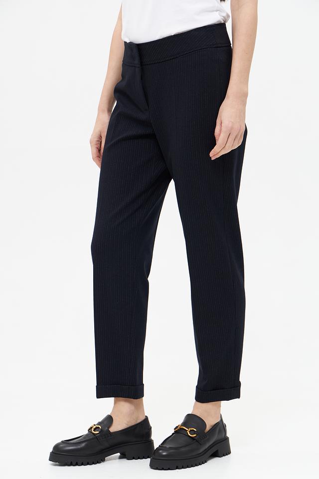 Представляем элегантные брюки от бренда Bianca, выполненные в классическом черном цвете с деликатной вертикальной полоской. Эта модель станет отличным дополнением к вашему гардеробу, позволяя создавать разнообразные образы – от деловых до повседневных.