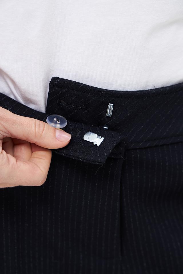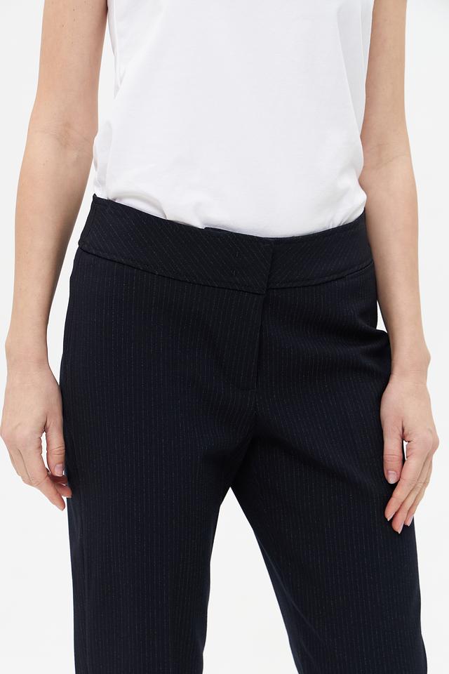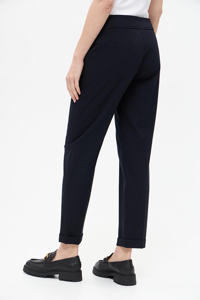 Брюки имеют прямой крой и слегка зауженный силуэт к низу, что визуально удлиняет ноги. Пояс оформлен эластичной резинкой, обеспечивающей комфортную посадку по фигуре. Застежка – молния и пуговица. Брюки слегка укороченные, что позволяет носить их с туфлями, лоферами или ботинками.