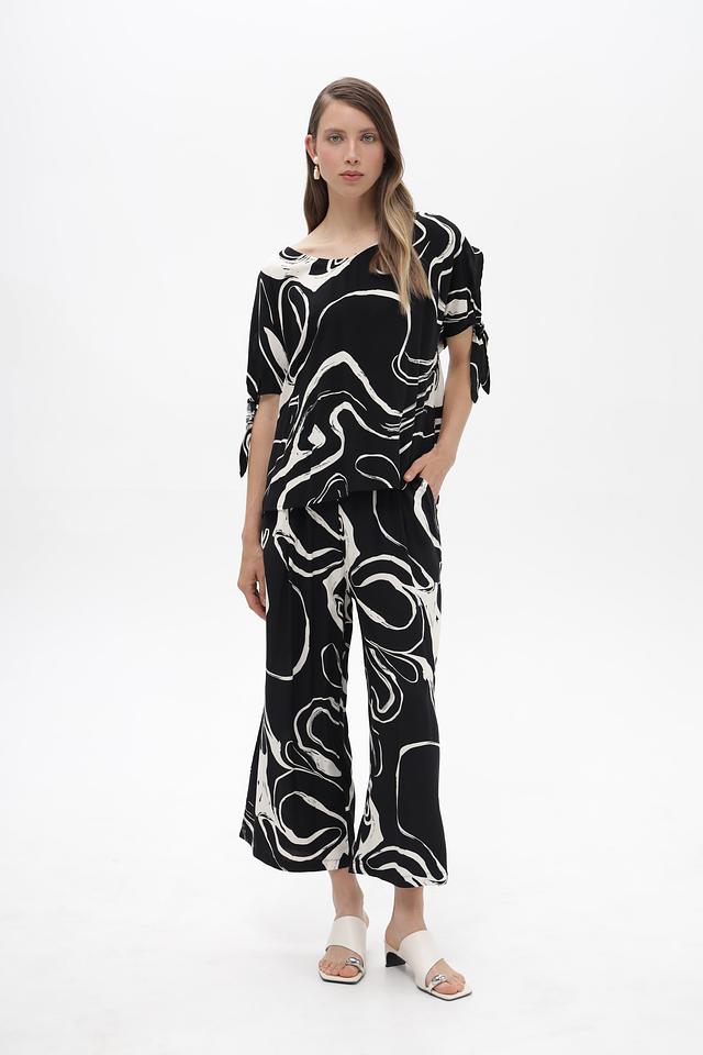 Женские брюки Broadway чёрно-белого цвета с оригинальным принтом и завязками на поясе. Модель выполнена из мягкой вискозы, обеспечивающей комфорт в носке и свободу движений. Состав: вискоза 100%