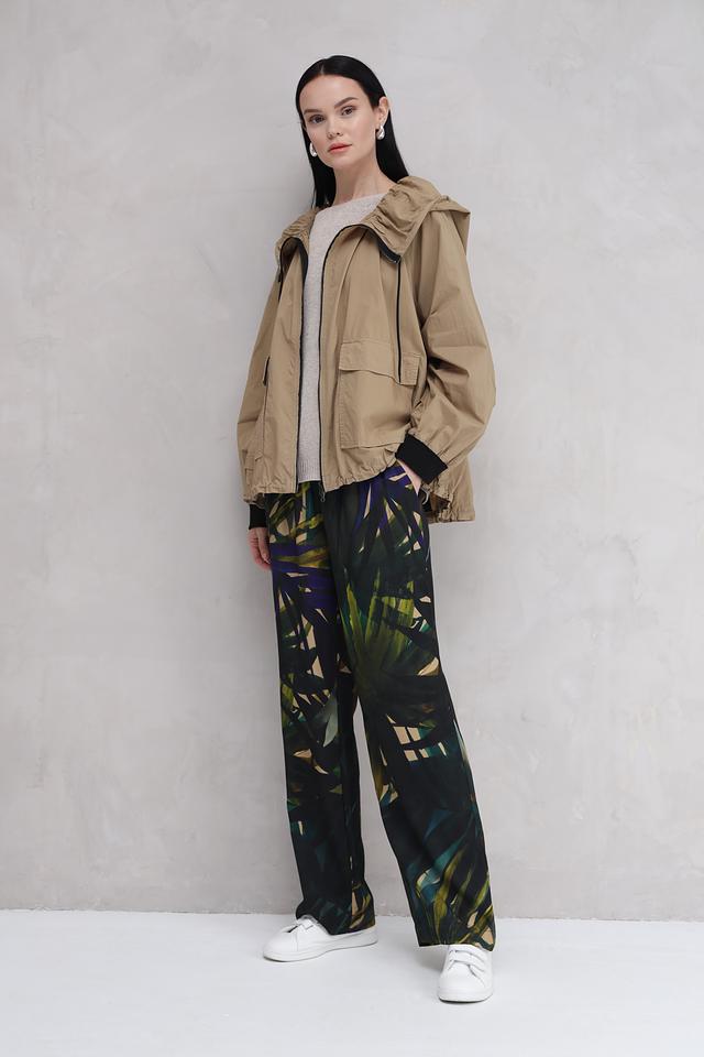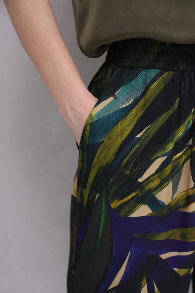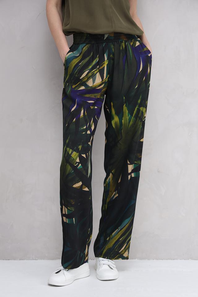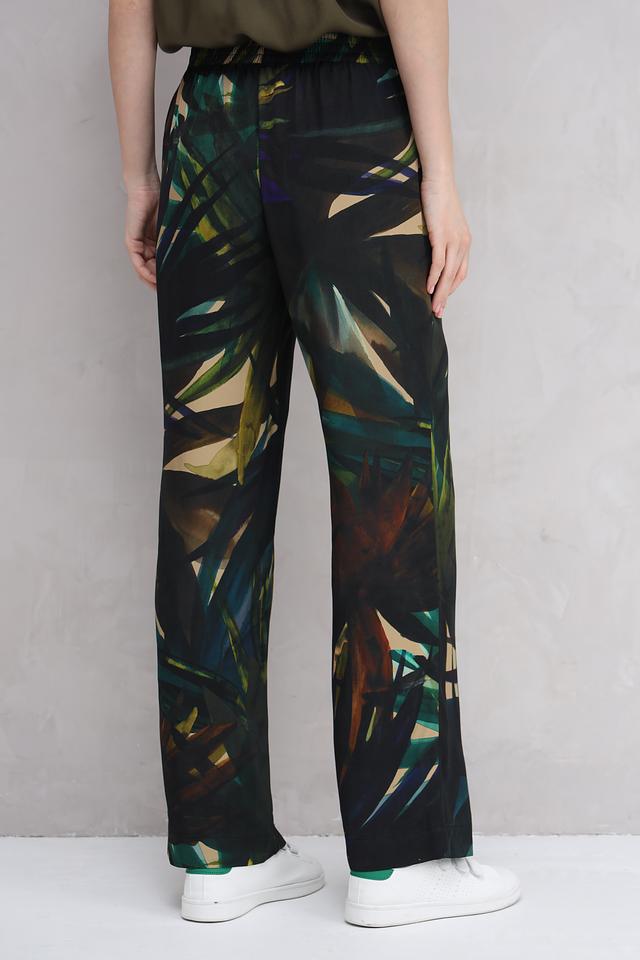 Брюки имеют прямой крой и широкие штанины, обеспечивающие свободу движений. Эластичный пояс гарантирует удобную посадку по фигуре. Главная особенность брюк – эффектный принт с изображением тропических листьев, выполненный в разнообразных оттенках зеленого, синего и желтого.