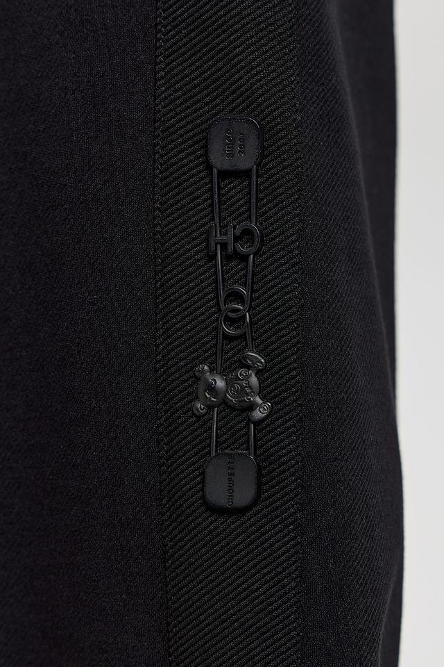 По бокам брюк расположена декоративная полоса с логотипом бренда, придающая им современный и модный вид. Состав ткани включает вискозу, полиэстер, хлопок и полиуретан, что обеспечивает комфорт и практичность в носке.