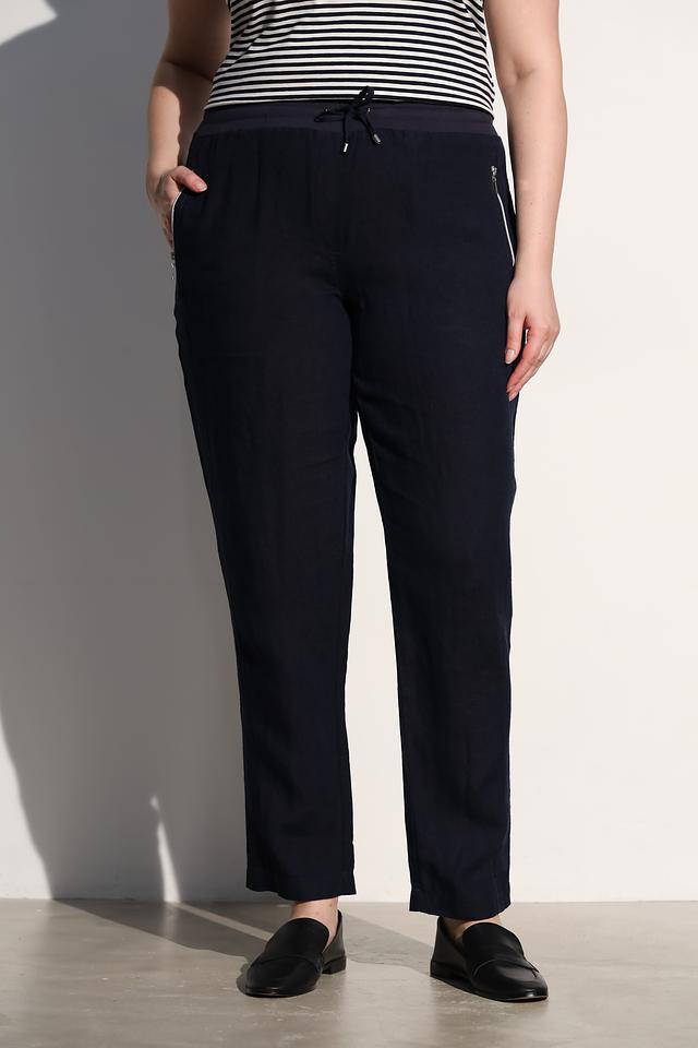 Женские брюки от Doris Streich темно-синего цвета выполнены из 100% льна. Модель прямого кроя с эластичным поясом и боковыми карманами, обеспечивающими комфорт и практичность. Состав: лен 100%