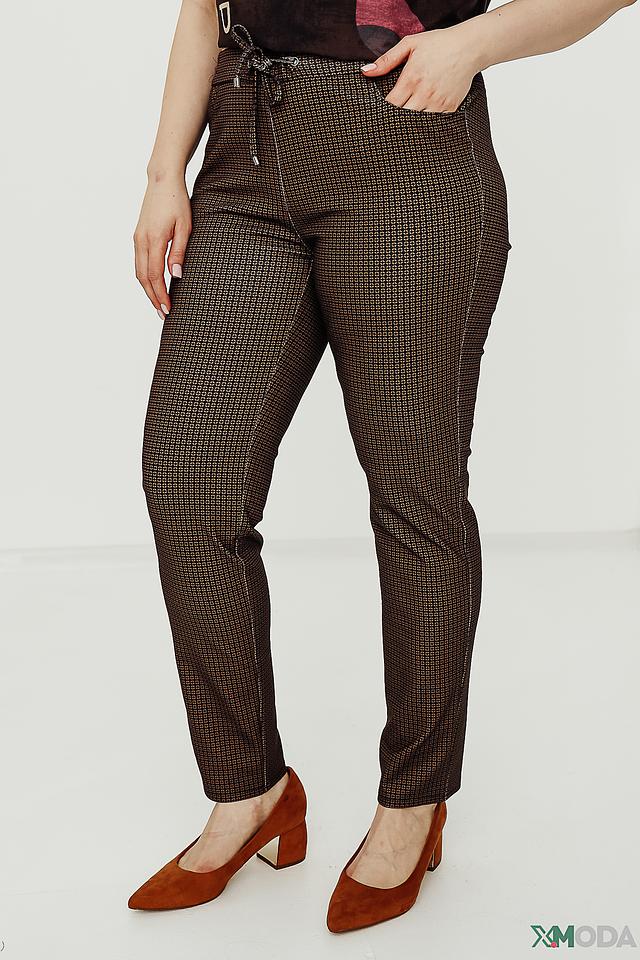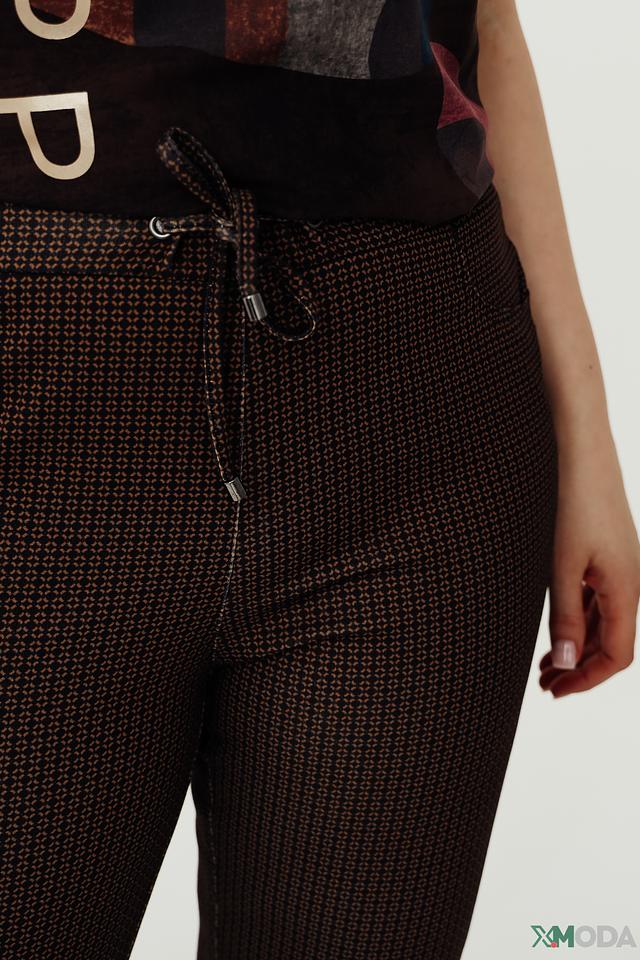 Характерным элементом дизайна является клетчатый принт в коричневой гамме. Брюки имеют удобный пояс на резинке с завязками, а также два боковых кармана. Прямой крой и слегка зауженные книзу штанины визуально удлиняют силуэт.