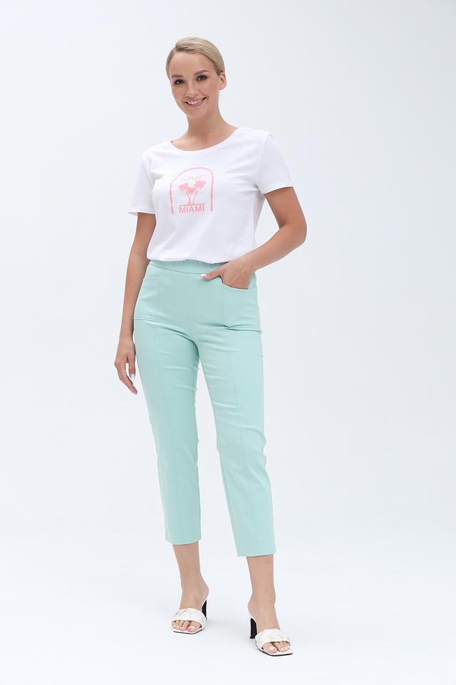 Брюки имеют прямой крой и классическую посадку по фигуре. Эластичный пояс обеспечивает комфортную посадку, а вертикальные вытачки визуально удлиняют силуэт.