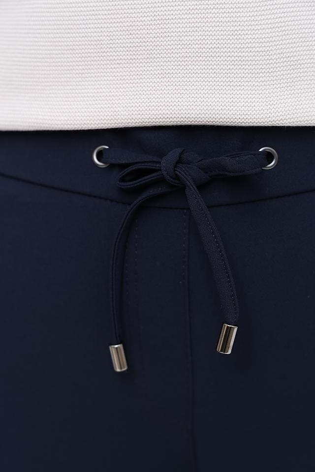 Брюки имеют прямой крой и стандартную посадку по фигуре. Эластичный пояс дополнен шнурком с металлическими фиксаторами, что позволяет регулировать посадку и обеспечивает максимальный комфорт.