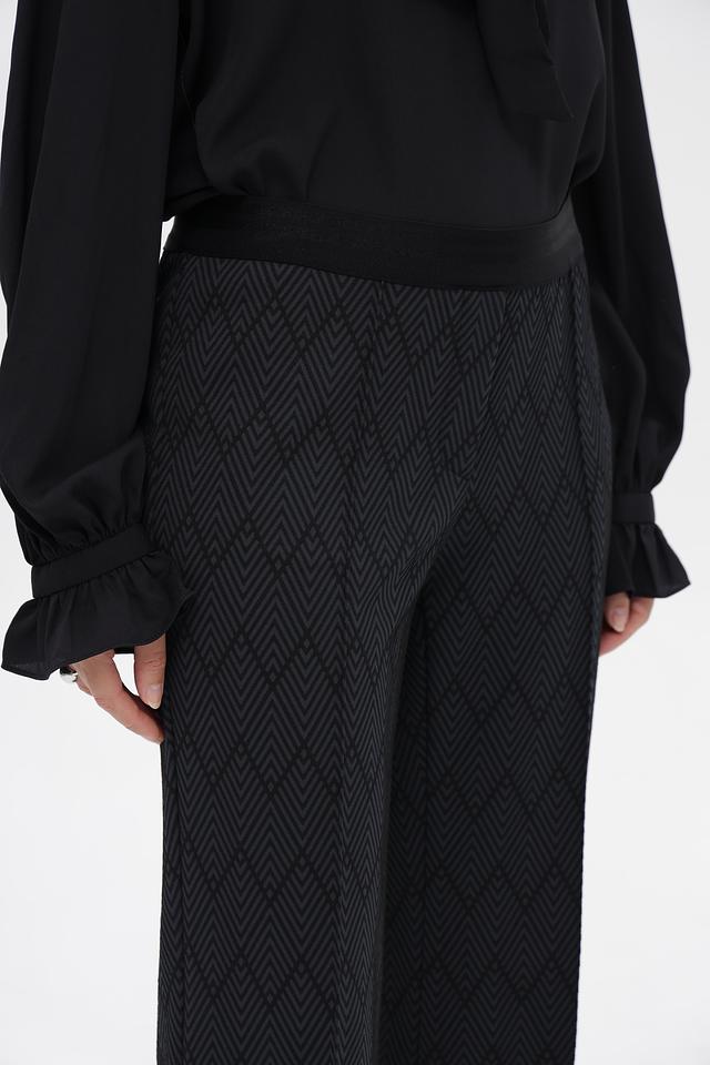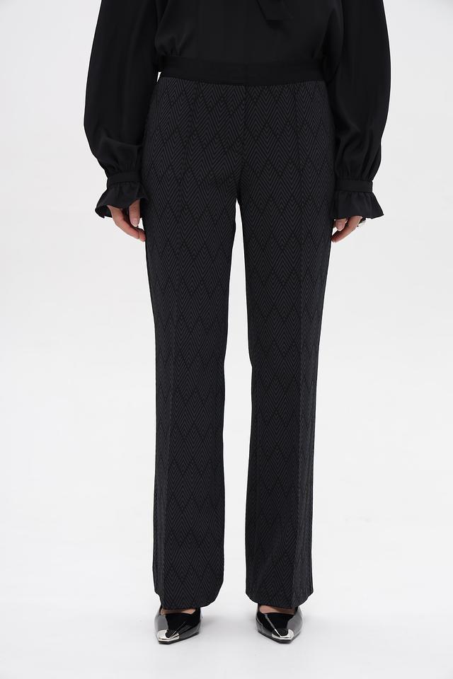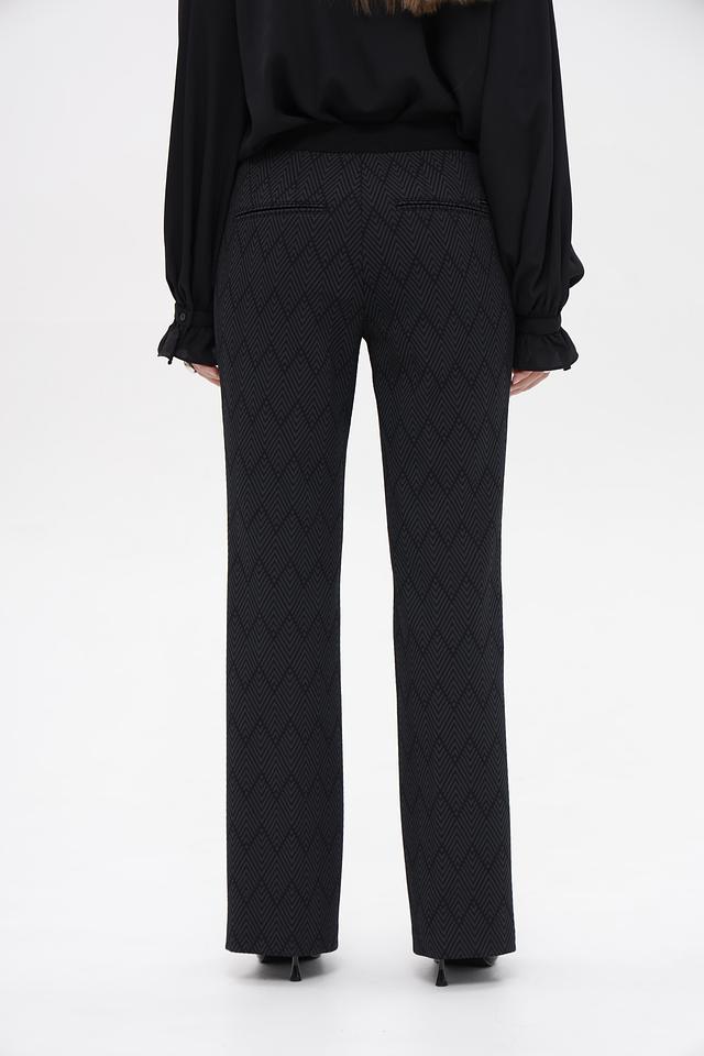 Брюки имеют классический крой с прямыми штанинами и завышенной талией. Они изготовлены из высококачественного полиамида с добавлением эластана (2%), что обеспечивает комфортную посадку и свободу движений.