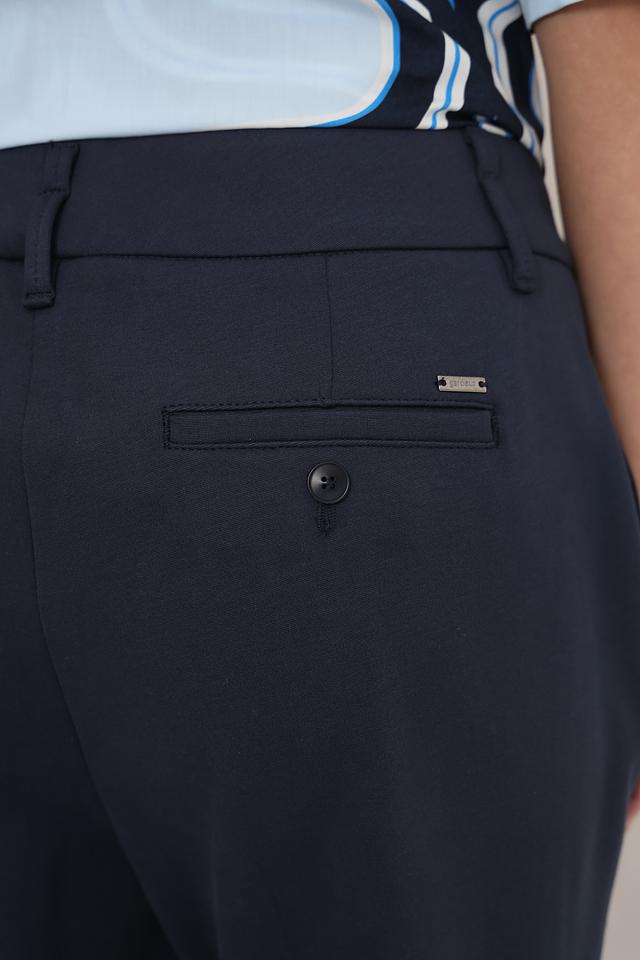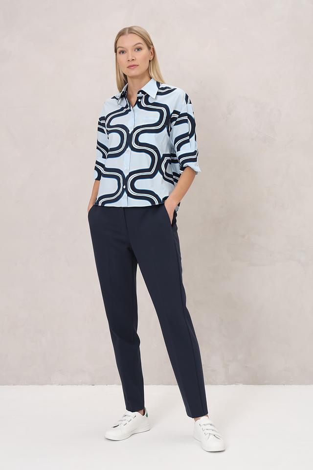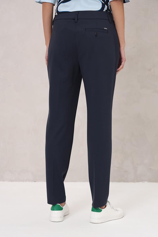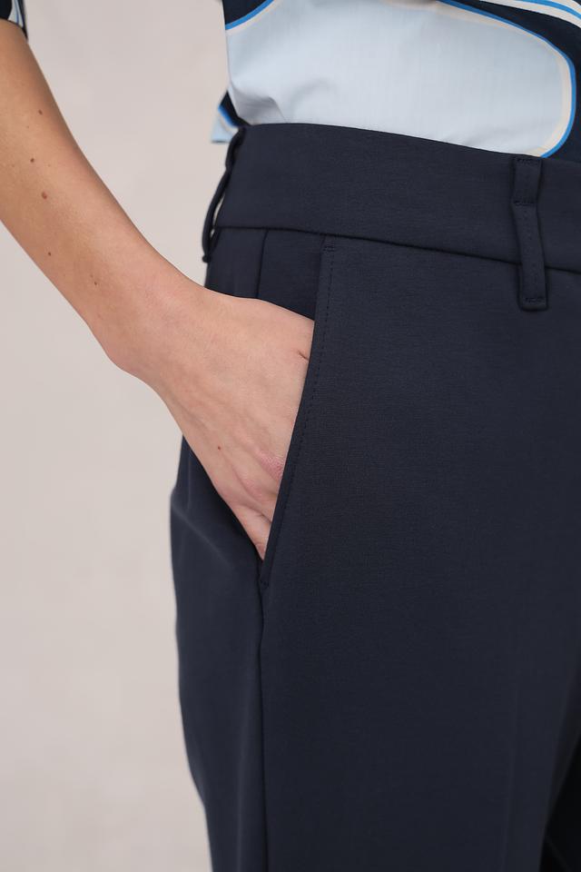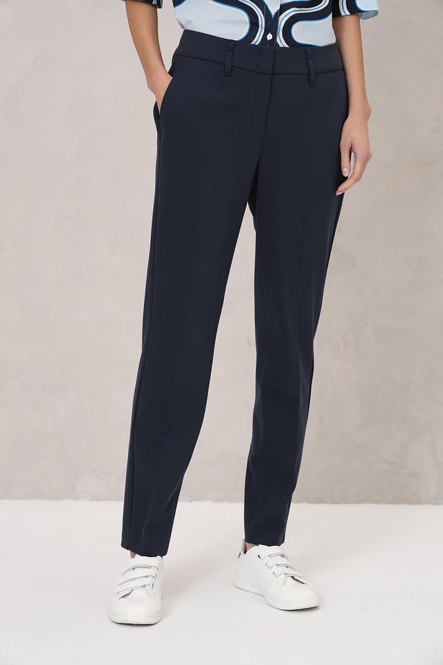 Брюки выполнены в насыщенном темно-синем цвете, который легко сочетается с различными оттенками и фактурами. Прямой крой и стандартная посадка обеспечивают комфортную посадку по фигуре, а лаконичный дизайн делает их универсальными.