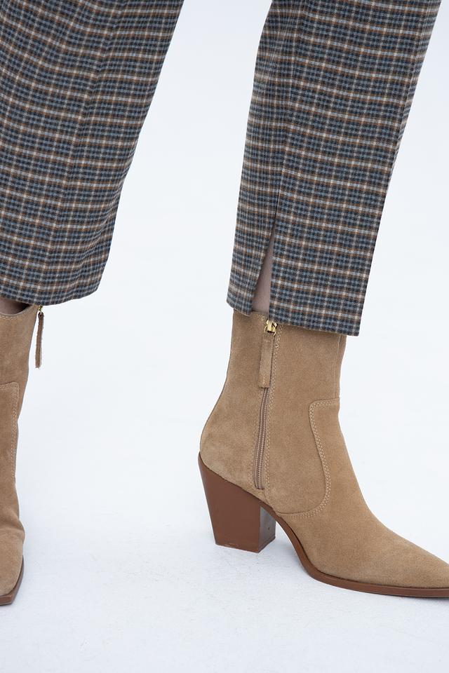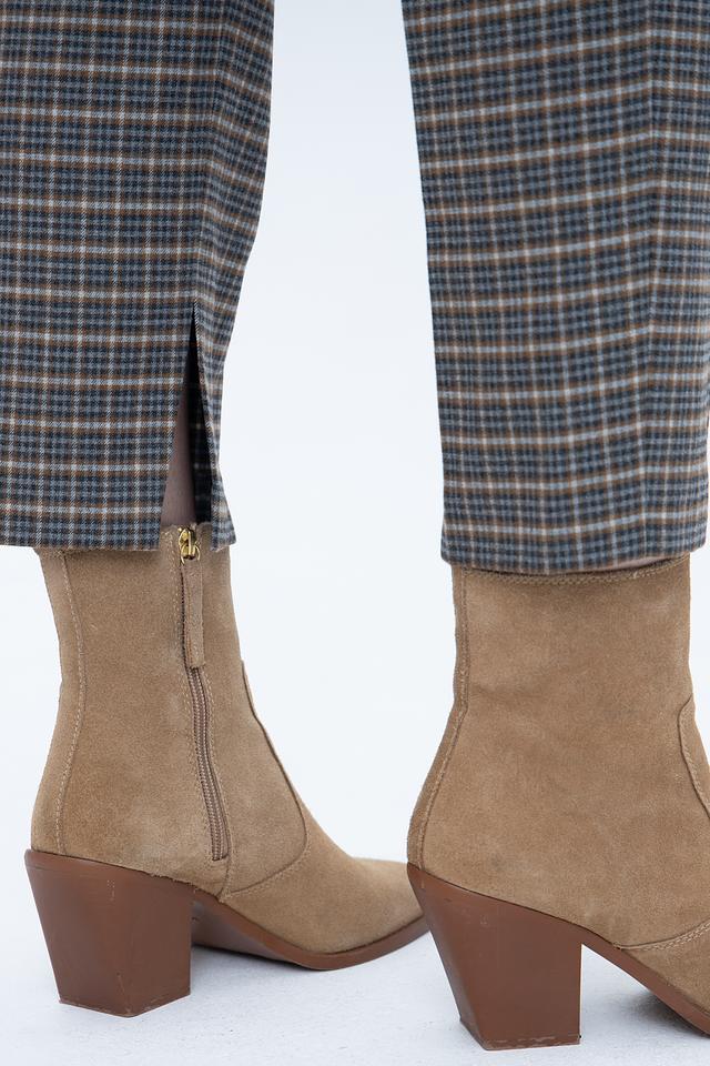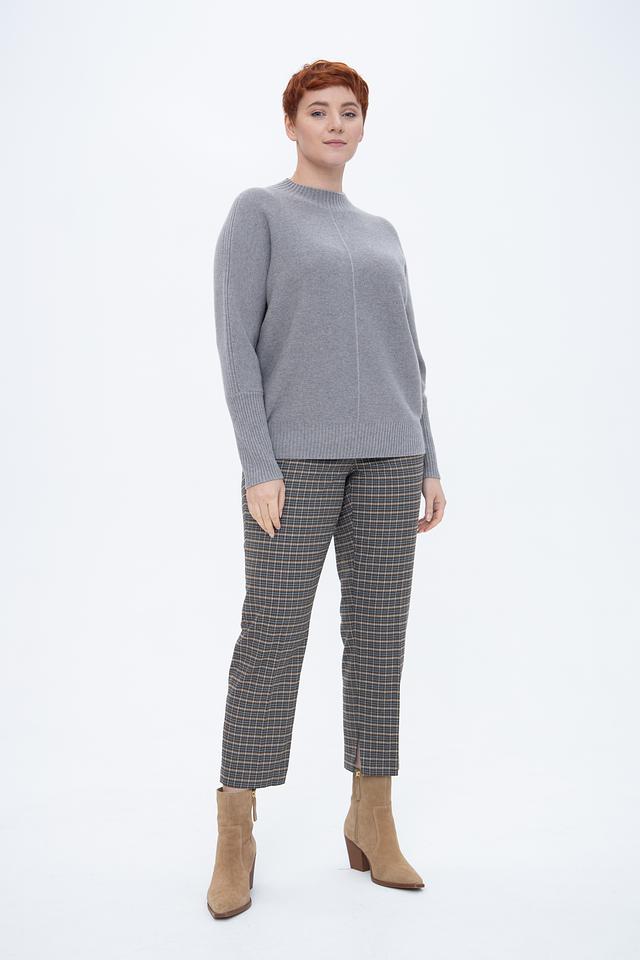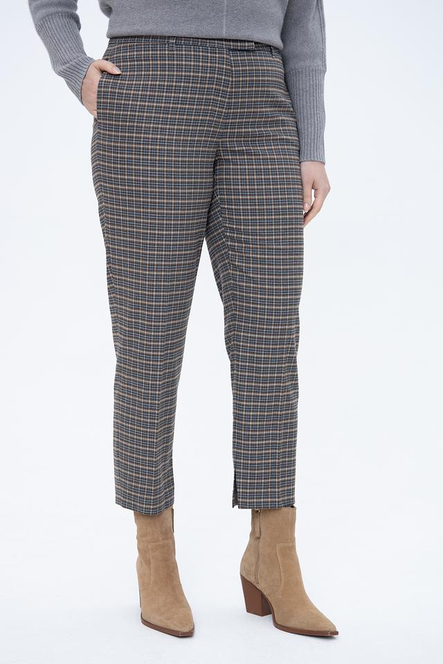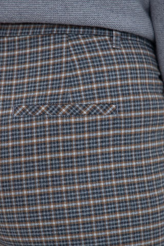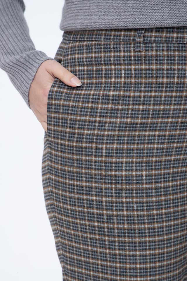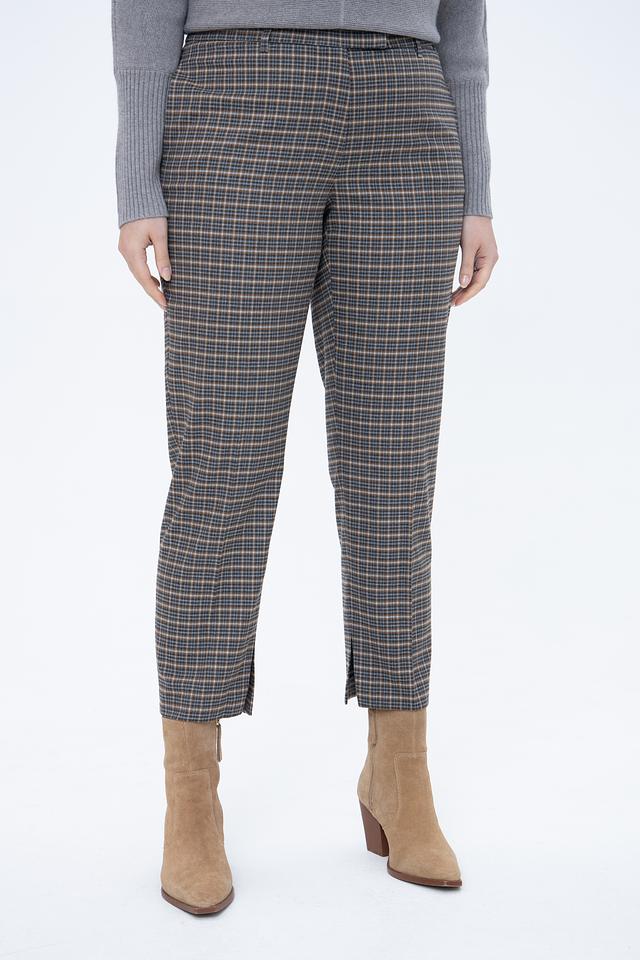 Особенностью данной модели является клетчатый принт в коричнево-синей гамме, который придает брюкам элегантный и утонченный вид. Брюки застегиваются на молнию и пуговицу. Небольшой разрез по низу брюк добавляет образу современности.