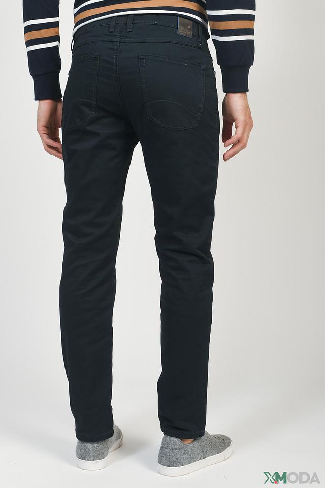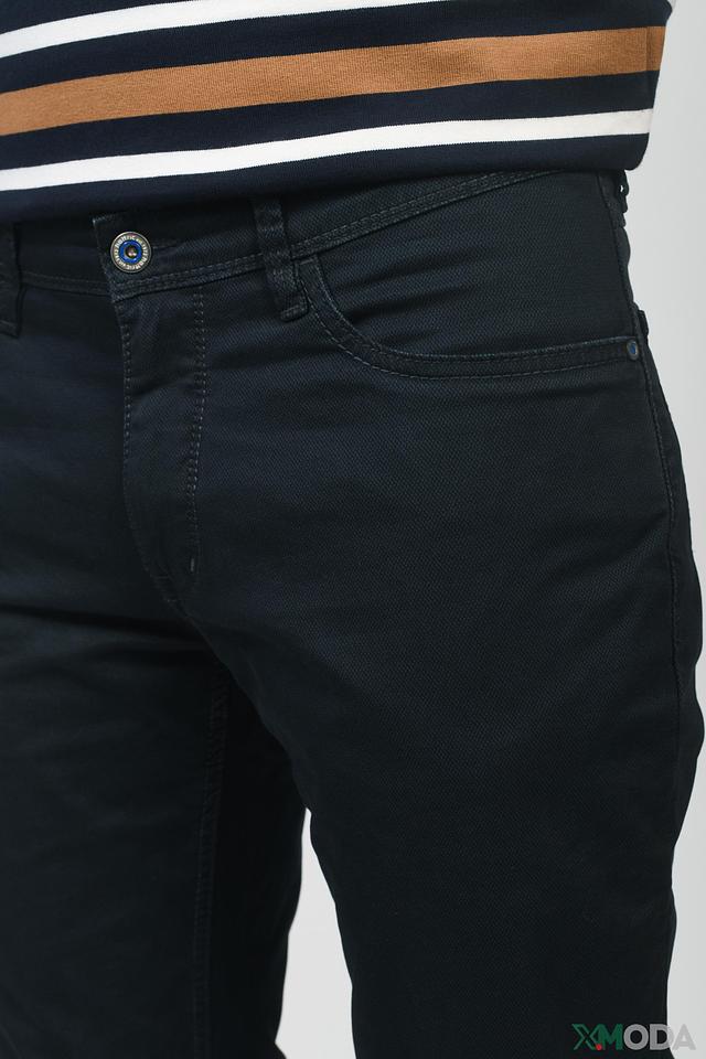 Цвет брюк – темно-синий, универсальный и легко сочетаемый с различными элементами гардероба. Брюки имеют стандартную посадку на поясе, застежку на молнию и пуговицу. На задних карманах расположены декоративные швы.