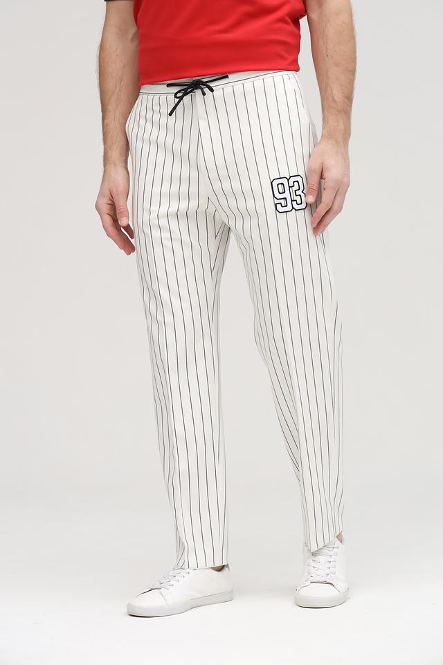 Брюки имеют удобный крой с эластичным поясом и завязками, обеспечивающими надежную фиксацию и комфортную посадку. На левой штанине расположен декоративный элемент с номером 93, добавляющий оригинальности образу. Модель выполнена из высококачественного сочетания материалов: 67% полиэстера, 29% вискозы и 4% эластана.