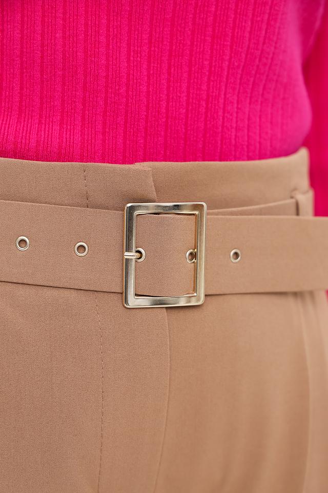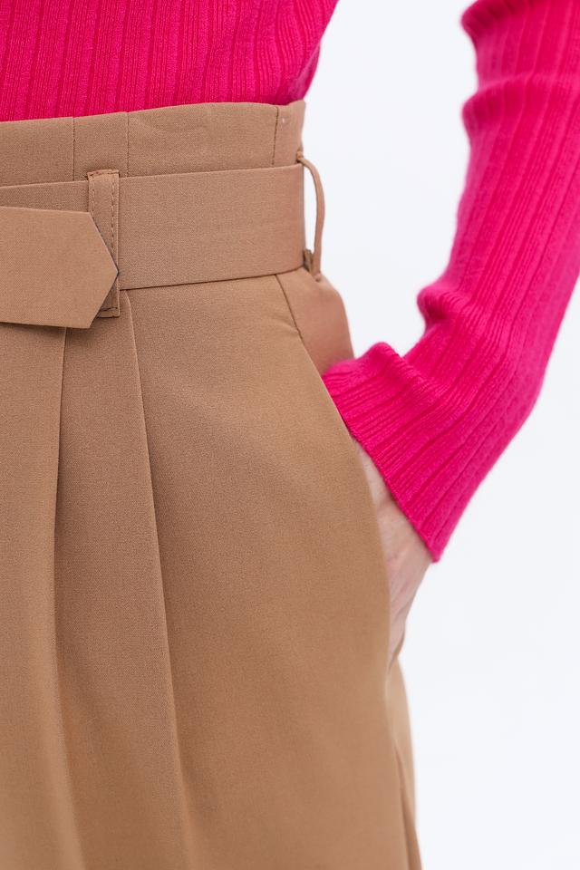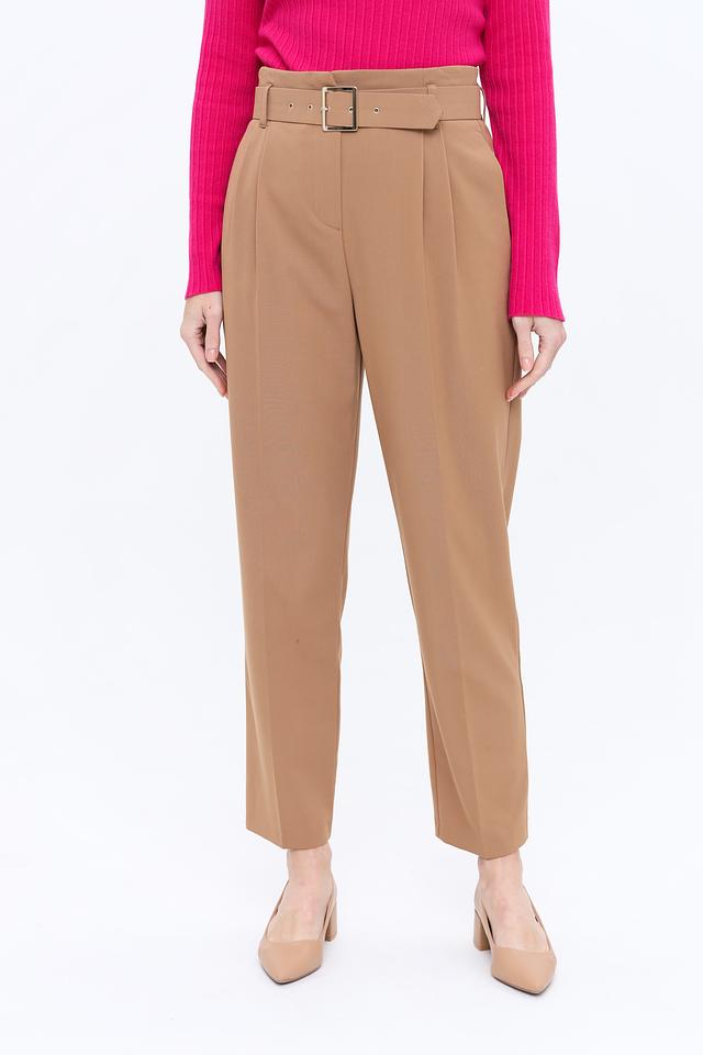 Брюки имеют высокую посадку и пояс с пряжкой, который подчеркивает талию и создает женственный силуэт. Спереди брюки оформлены защипами, что придает им более изысканный вид. Застежка – молния и пуговица.