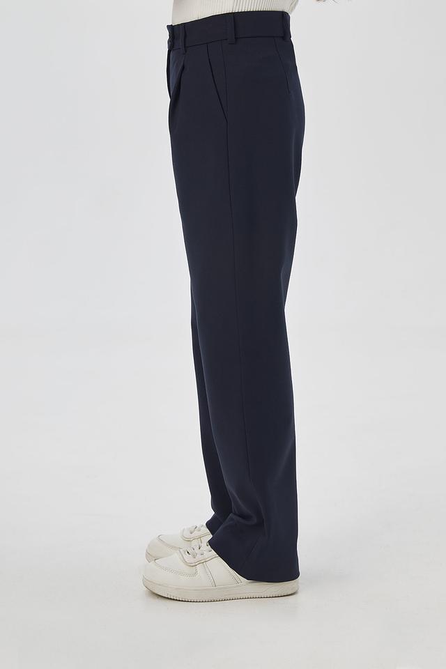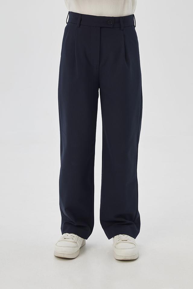 Брюки имеют прямой крой и широкие штанины, обеспечивающие свободу движений и комфорт в течение всего дня. Модель дополнена аккуратными складками спереди, что придает ей более элегантный вид. Застежка на пуговицу и молнию обеспечивает надежную фиксацию.