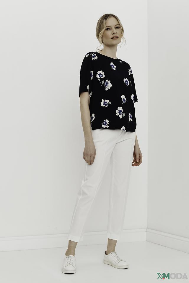 Брюки имеют прямой крой, подчеркивающий фигуру, и стандартную посадку по талии. Передняя часть брюк украшена аккуратными вытачками, добавляющими им элегантности. Застежка – молния и пуговица. Материал – высококачественный хлопок (97%) с добавлением эластана (3%), обеспечивающий комфорт и свободу движений.