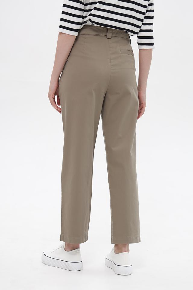 Брюки имеют классическую застежку на пуговицу и молнию, а также боковые карманы. Особенности дизайна включают аккуратные складки спереди, которые придают брюкам более элегантный вид. Данная модель идеально сочетается с различными видами верхней одежды и обуви, позволяя создавать разнообразные образы.