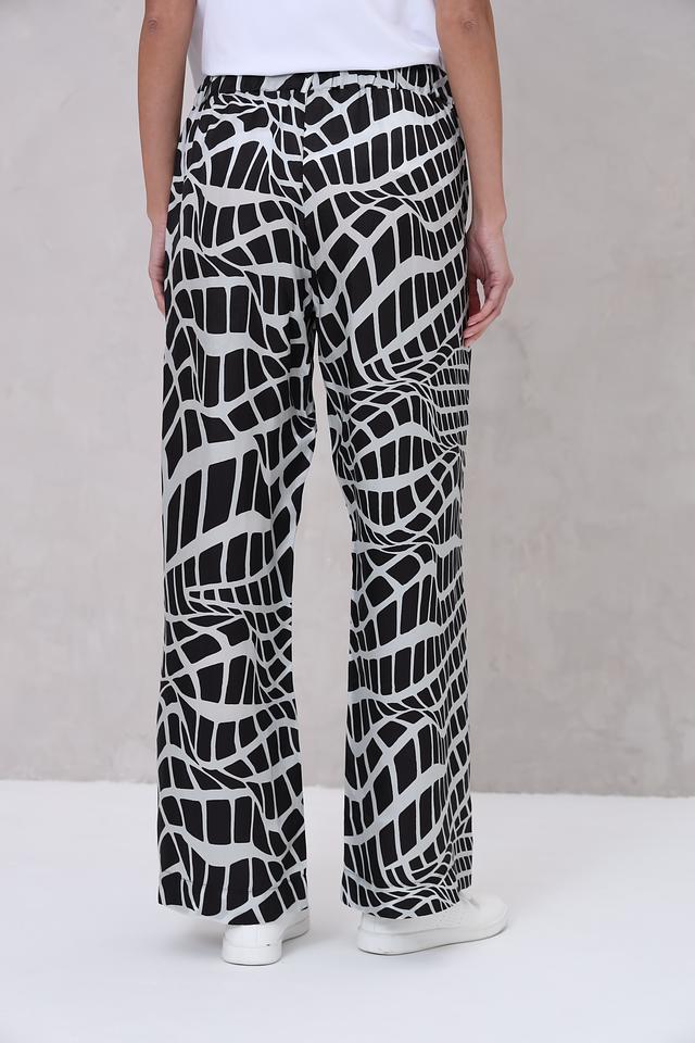 Особенностью модели является яркий геометрический принт в чёрно-белой гамме, который придаёт брюкам современный и стильный вид. Прямой крой и эластичный пояс на талии обеспечивают удобную посадку по фигуре.