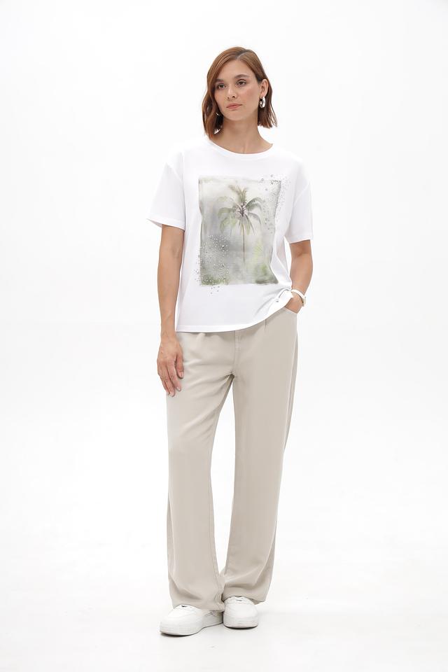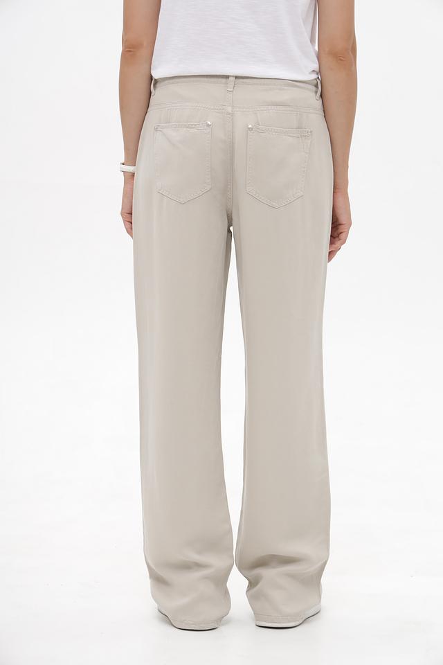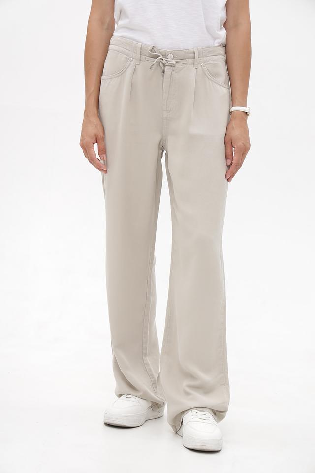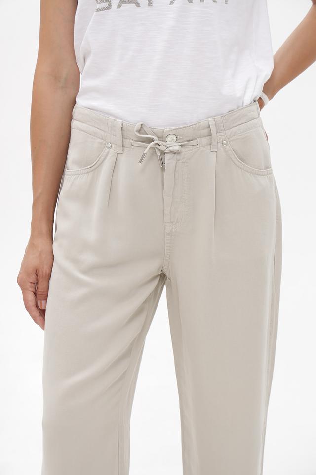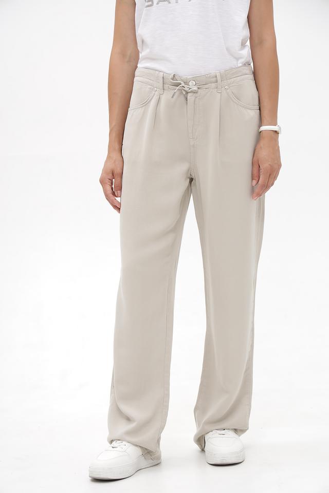 Брюки имеют прямой крой и классический бежевый цвет, который легко сочетается с различными элементами одежды. Эластичный пояс со шнурком позволяет регулировать посадку по фигуре, обеспечивая максимальный комфорт в течение дня.