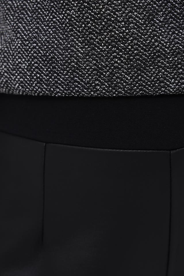 Особенностью данной модели является использование эко-кожи в качестве декоративных вставок. Эти вставки расположены на бедрах и придают брюкам более современный и эффектный вид. Высокая посадка и узкий крой подчеркивают достоинства фигуры и создают элегантный силуэт.