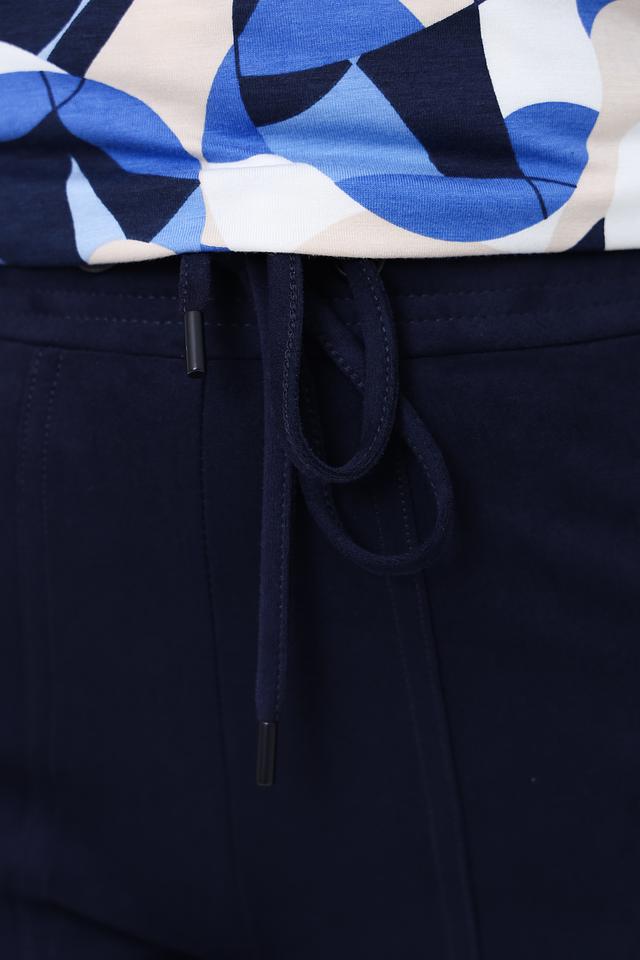 Темно-синие брюки от Olsen — это стильное и комфортное решение для повседневного гардероба. Модель выполнена из мягкой ткани с добавлением эластана, обеспечивающего свободу движений. Брюки имеют удобный пояс на резинке и шнуровке. Состав: полиэстер 91%, эластан 9%