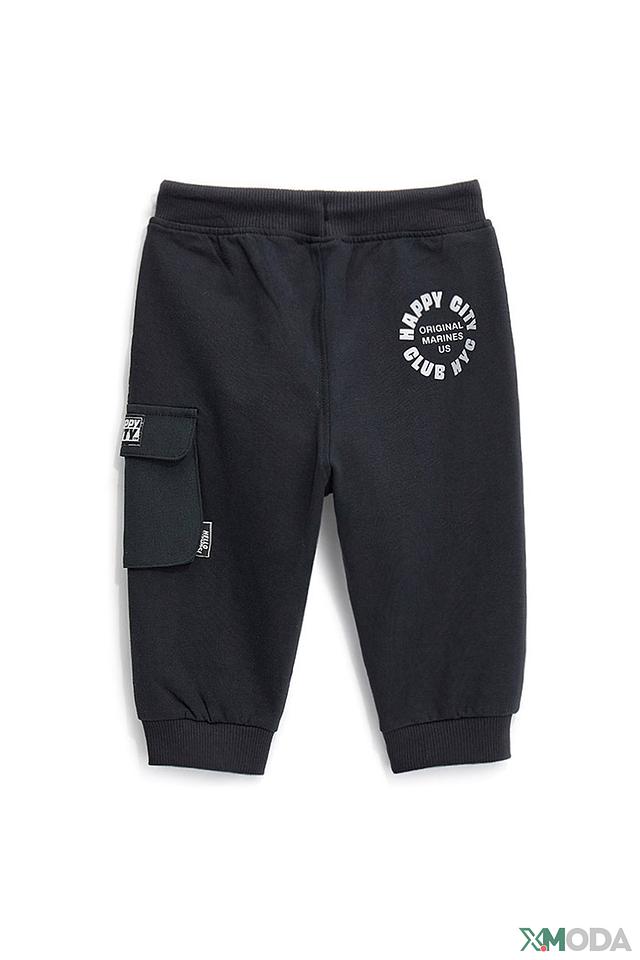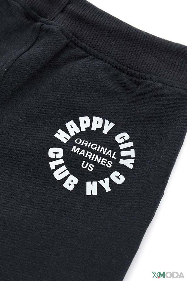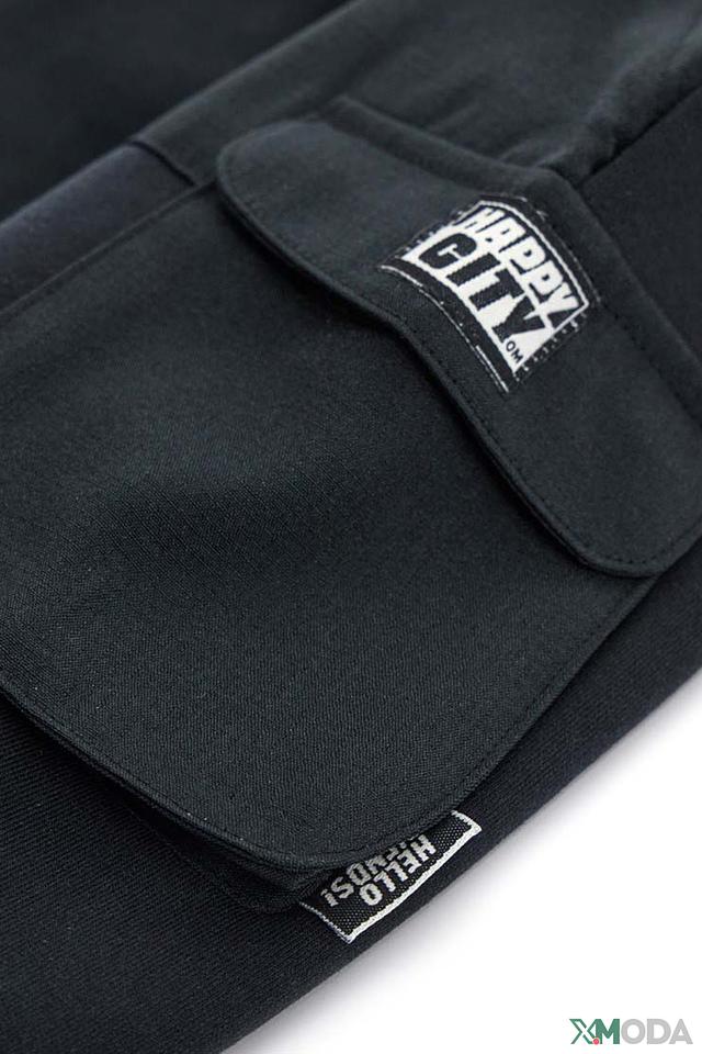 Дизайн брюк дополнен функциональными карманами и эластичным поясом со шнурком для регулировки посадки. На левой штанине расположен декоративный принт с логотипом бренда "Happy City Club US NYC".