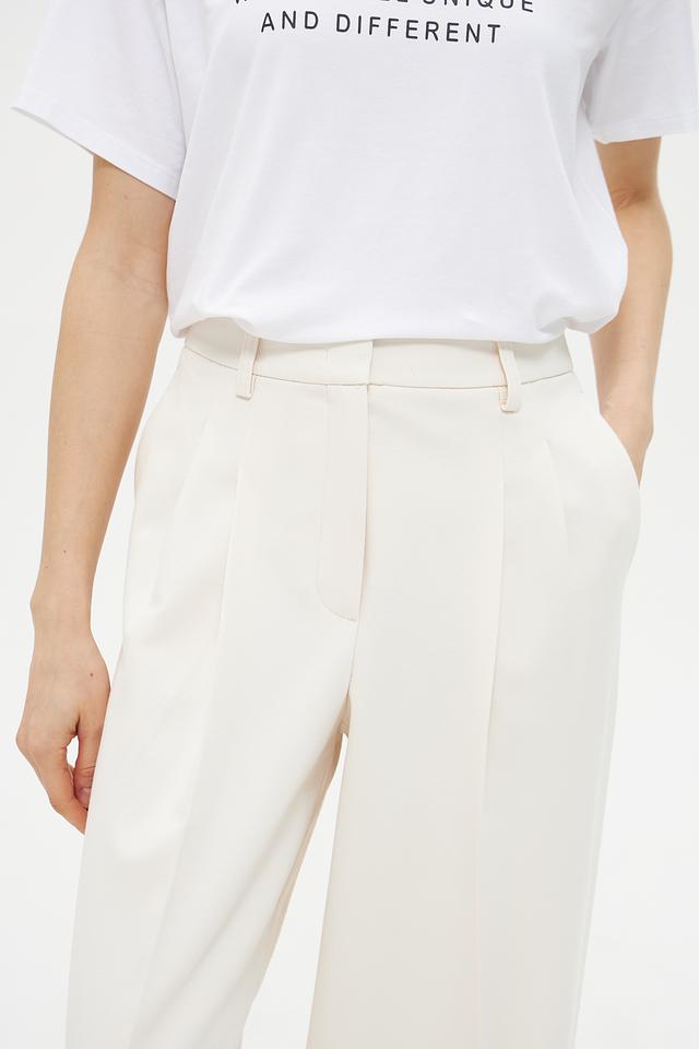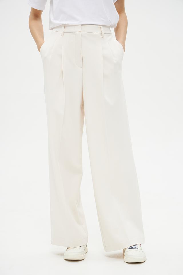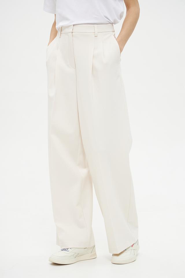 Брюки имеют прямой крой, высокую посадку и широкие штанины, что обеспечивает свободу движений и комфорт в течение всего дня. Классический дизайн дополнен аккуратными складками спереди, которые придают брюкам более изысканный вид.
