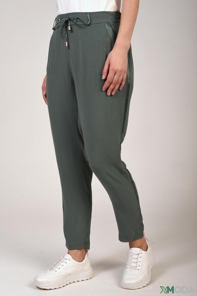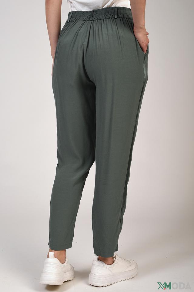 Модель имеет прямой крой, пояс на резинке с завязками и боковые карманы. Зауженный книзу силуэт визуально удлиняет ноги и делает образ более элегантным. Цвет хаки универсален и легко сочетается с различными элементами одежды.