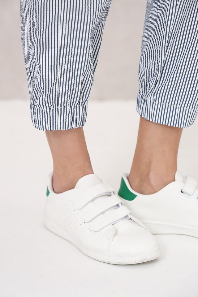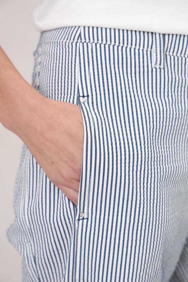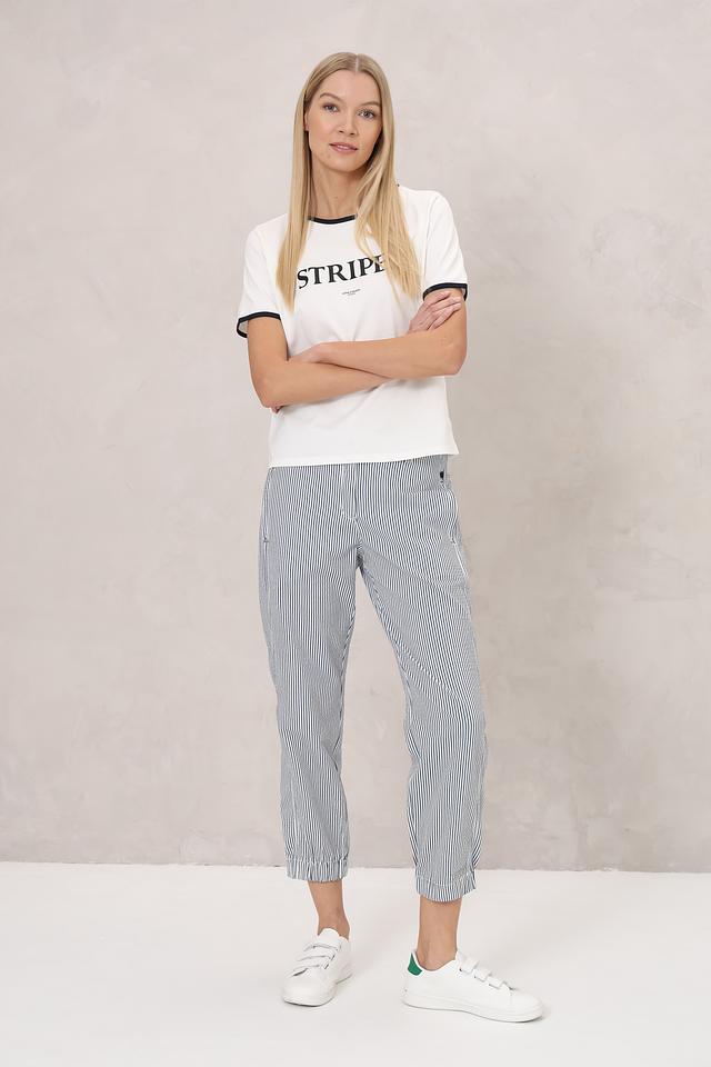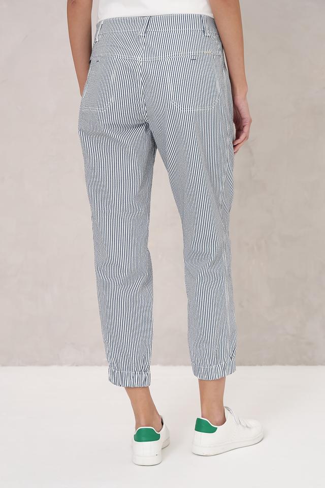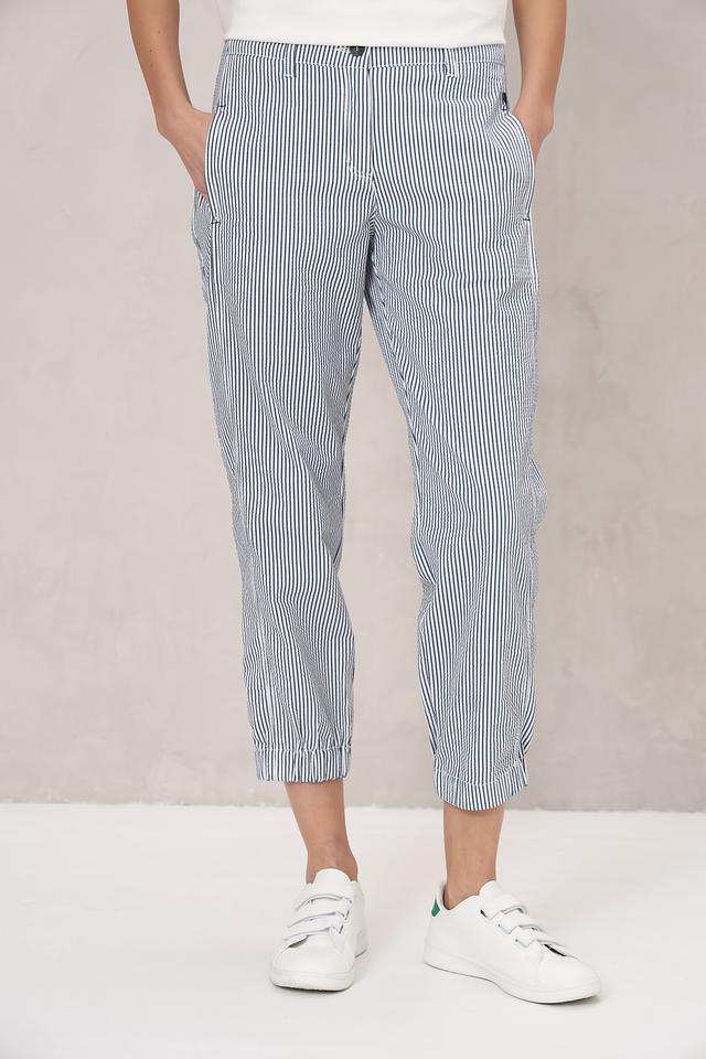 Женские брюки Ppep. синего цвета в полоску, выполнены из смесовой ткани с добавлением эластана для комфорта. Модель имеет зауженный к низу силуэт и удобную посадку. Состав: полиамид 66%, хлопок 28%, эластан 6%