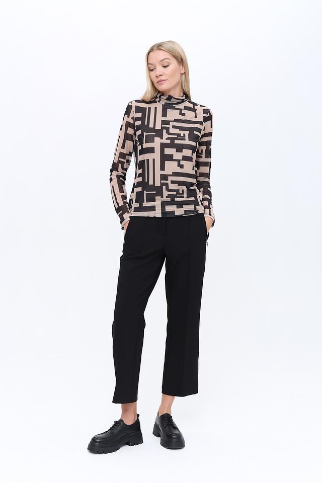 Брюки имеют прямой крой и стандартную посадку по талии. Застежка на молнию и пуговицу обеспечивает надежную фиксацию. Наличие боковых карманов добавляет функциональности.