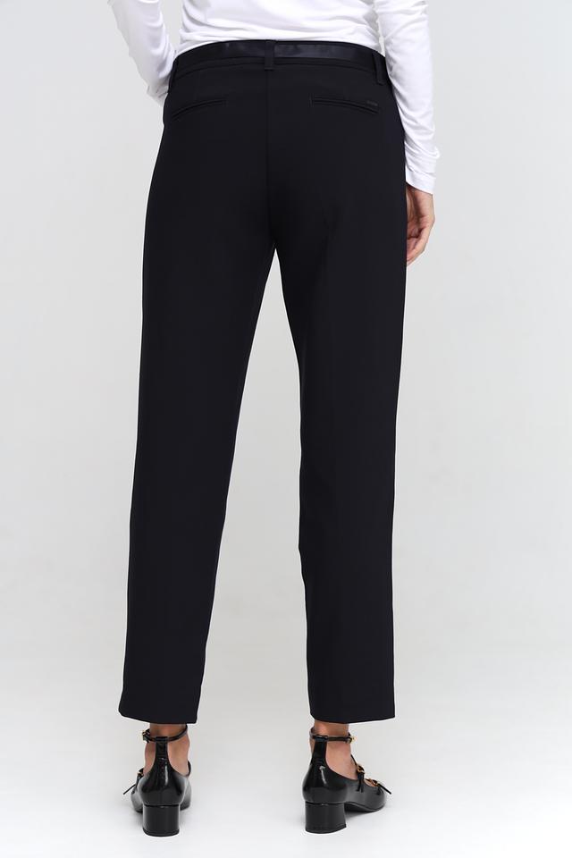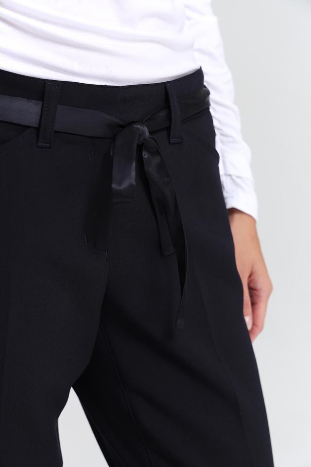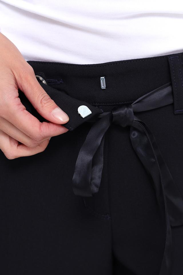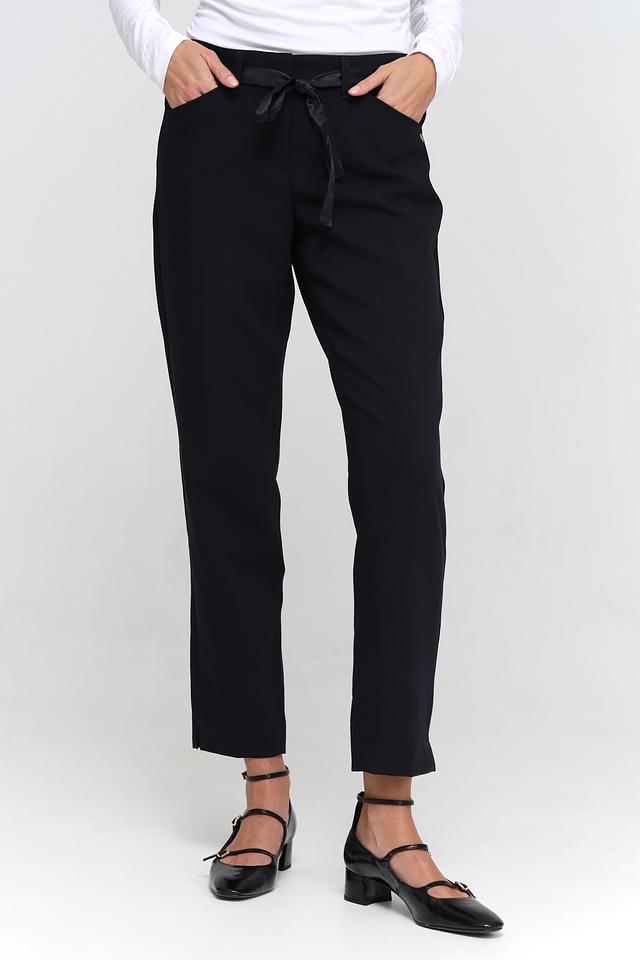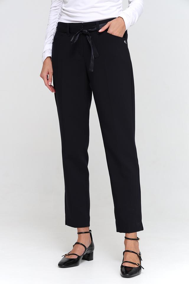 Брюки выполнены в чёрном цвете, который легко сочетается с любой одеждой и обувью. Прямой крой обеспечивает комфортную посадку по фигуре, а пояс с завязками позволяет подчеркнуть талию и создать более женственный силуэт.