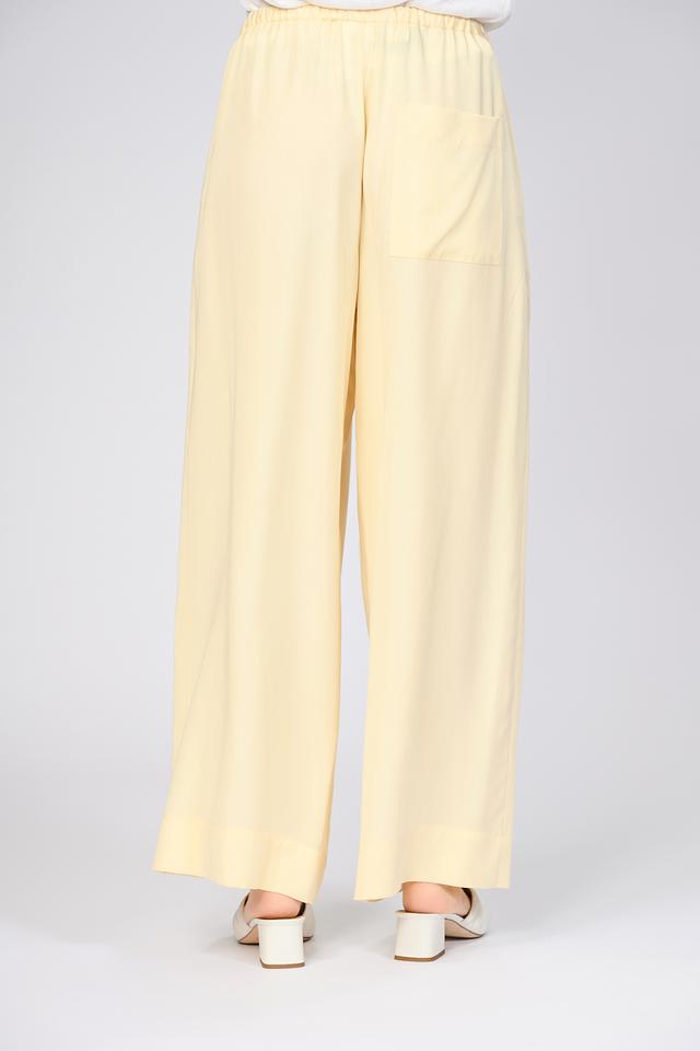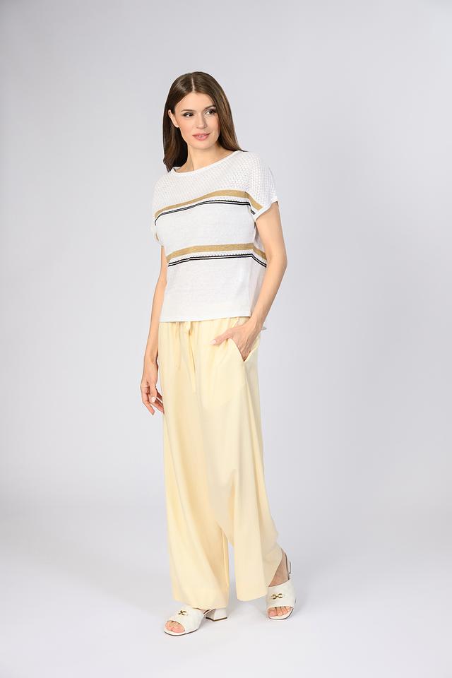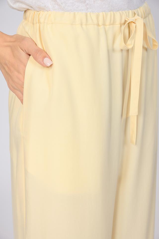 Брюки имеют свободный крой палаццо, который визуально удлиняет ноги и придает образу легкость. Завышенная талия подчеркивает силуэт, а пояс-завязка позволяет регулировать посадку по фигуре. Модель дополнена боковыми карманами, что делает ее не только стильной, но и практичной.