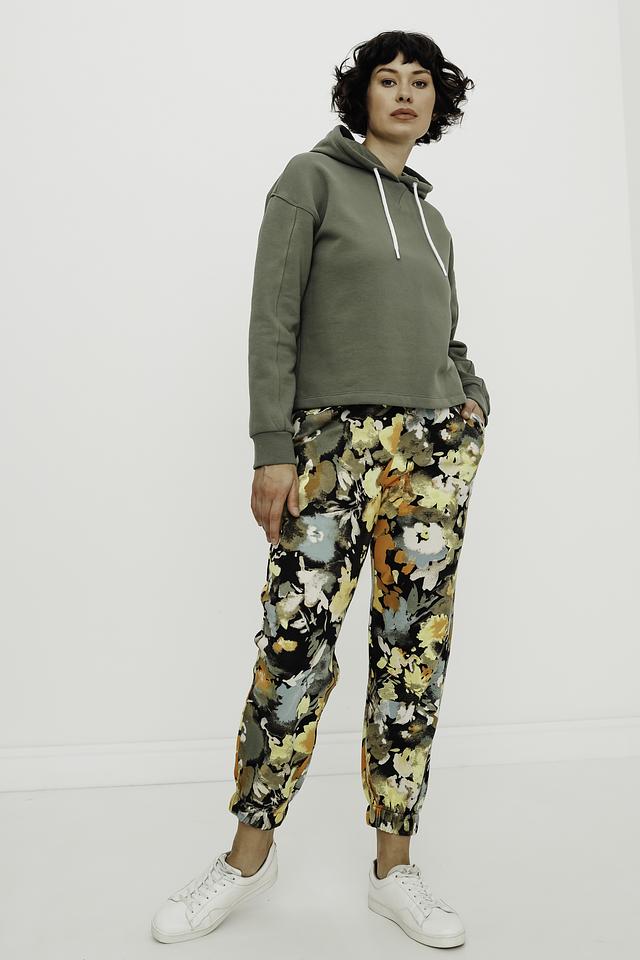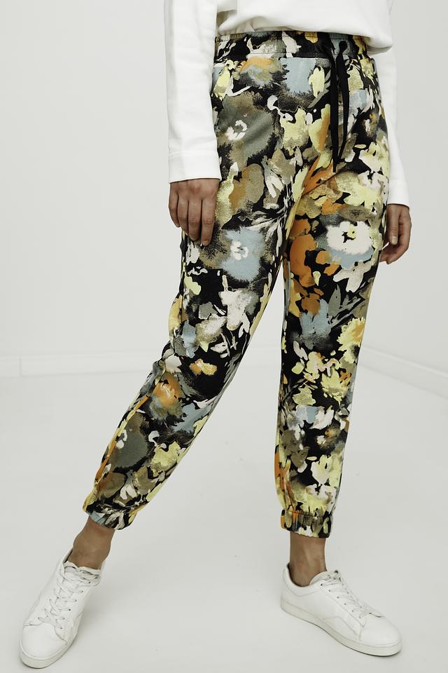 Брюки имеют оригинальный цветочный принт, сочетающий в себе оттенки оранжевого, жёлтого, голубого и чёрного. Удобный крой с эластичным поясом и манжетами внизу делает их идеальными для повседневной носки.