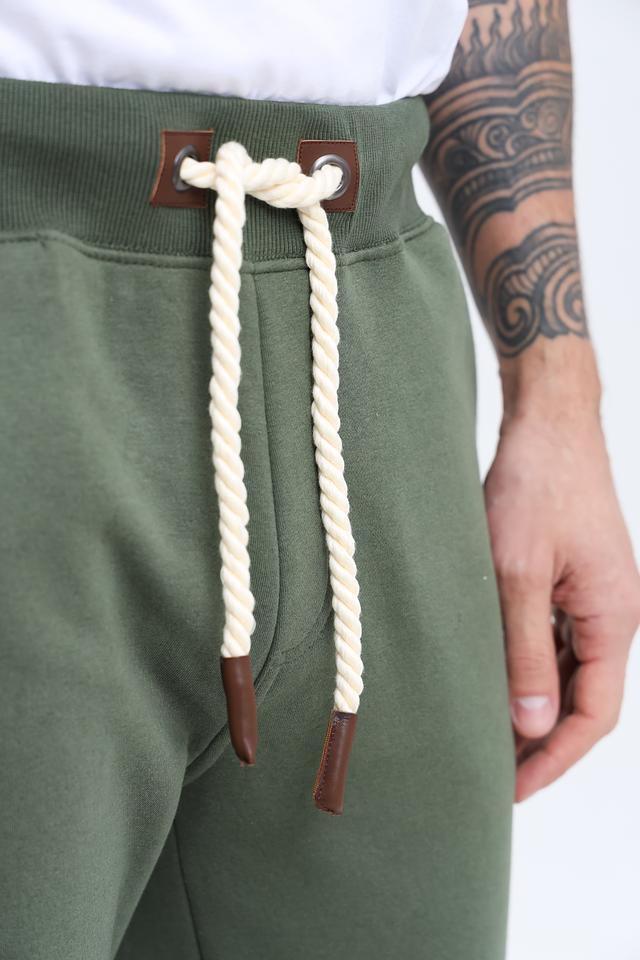 Брюки имеют удобный крой, не сковывающий движения, и эластичный пояс с регулирующим шнурком. Шнурок дополнен кожаными вставками и бежевым плетением, что придает брюкам стильный акцент.