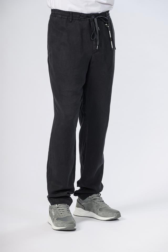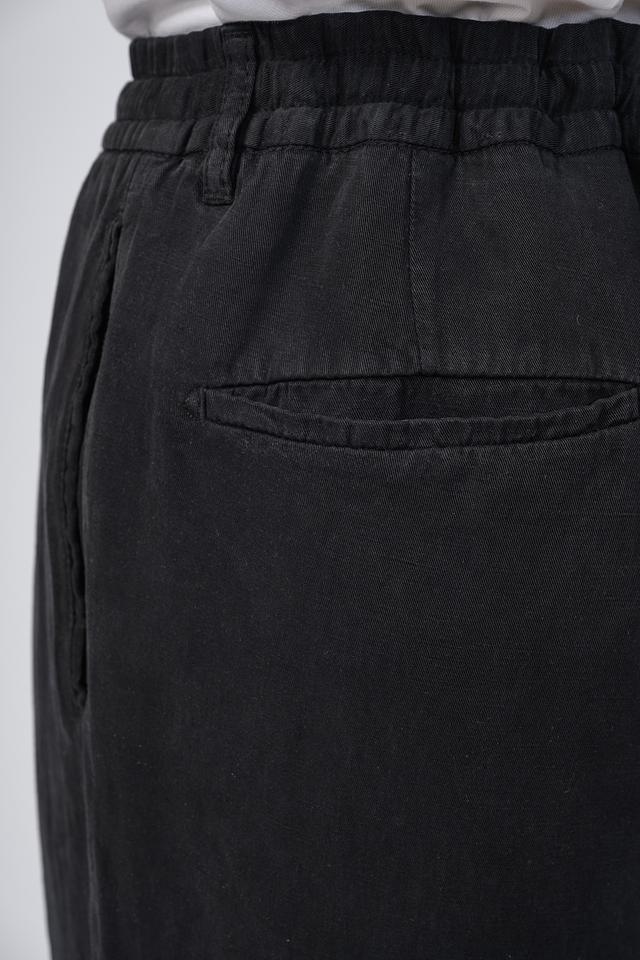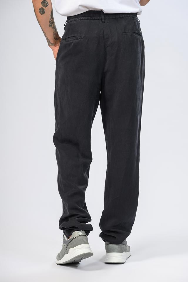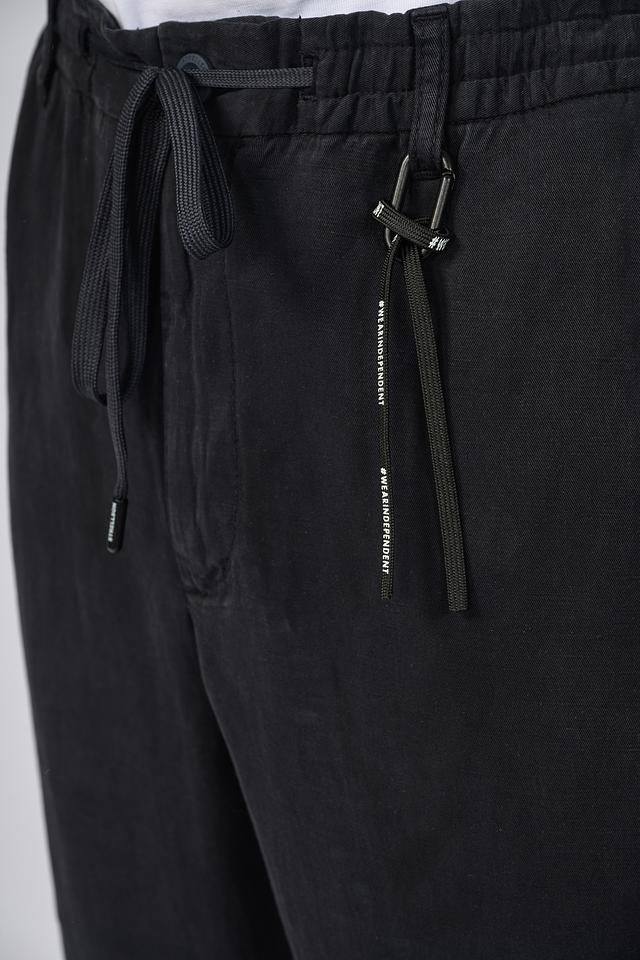 Брюки имеют два боковых и два задних кармана, что делает их практичными для повседневной носки. Шнурок на поясе позволяет регулировать посадку по фигуре. Материал брюк состоит из 60% вискозы и 40% льна, что обеспечивает приятные тактильные ощущения и воздухопроницаемость.