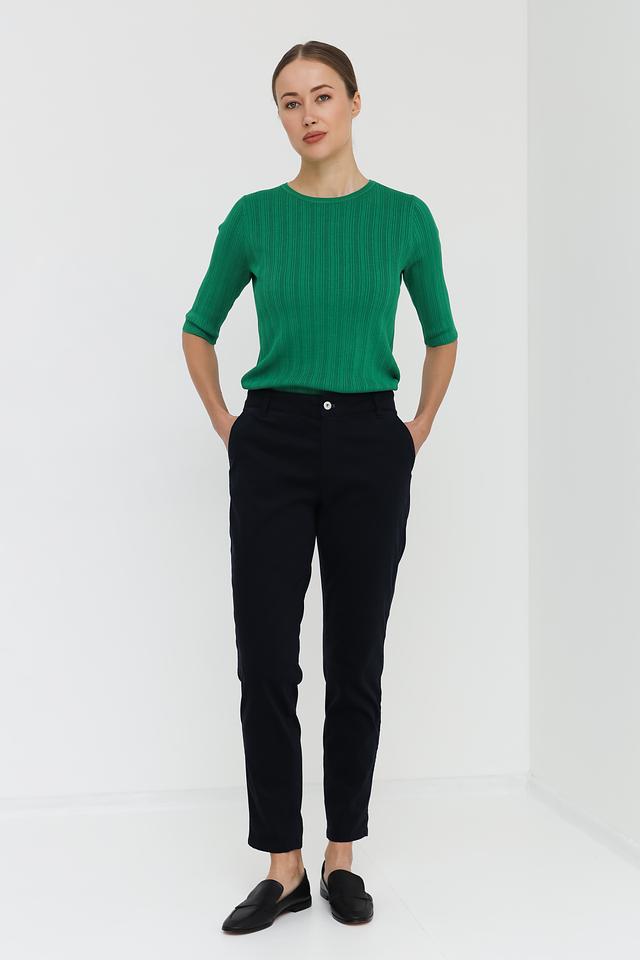 Брюки имеют прямой крой, который обеспечивает комфортную посадку по фигуре. Высокая посадка подчеркивает талию и визуально удлиняет ноги. Застежка на молнию и пуговицу обеспечивает надежную фиксацию.