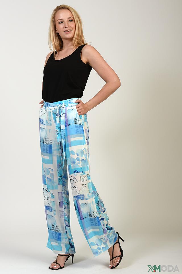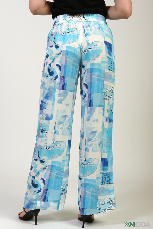 Особенностью модели является яркий и оригинальный принт в небесно-голубых тонах, который придаёт образу свежесть и динамичность. Брюки имеют свободный крой и широкие штанины, что обеспечивает свободу движений и создает элегантный силуэт.