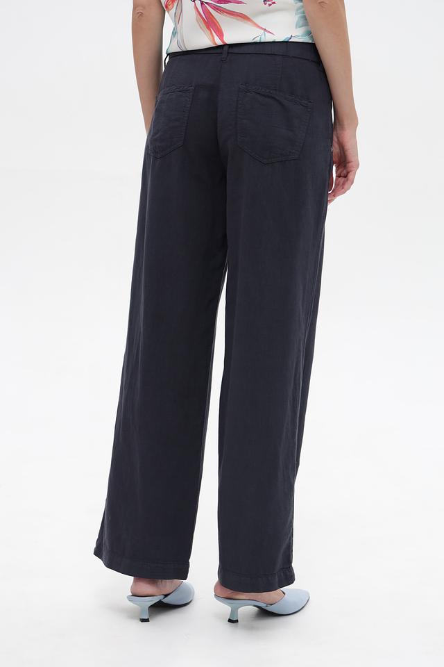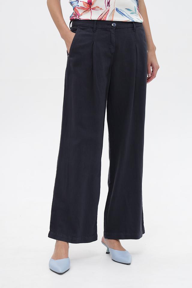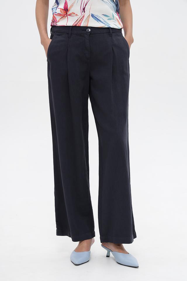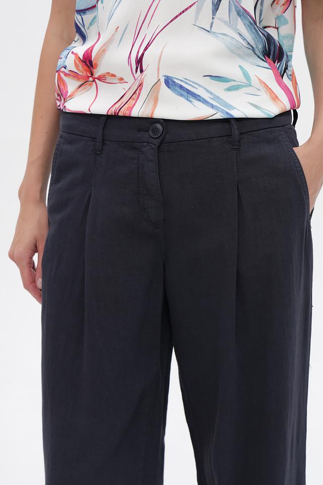 Классические брюки Toni collection темно-синего цвета, выполнены из смесовой ткани с добавлением хлопка, льна и лиоцелла. Модель прямого кроя с застрочной талией и боковыми карманами. Состав: хлопок 50%, лен 25%, луоселл 25%