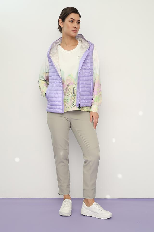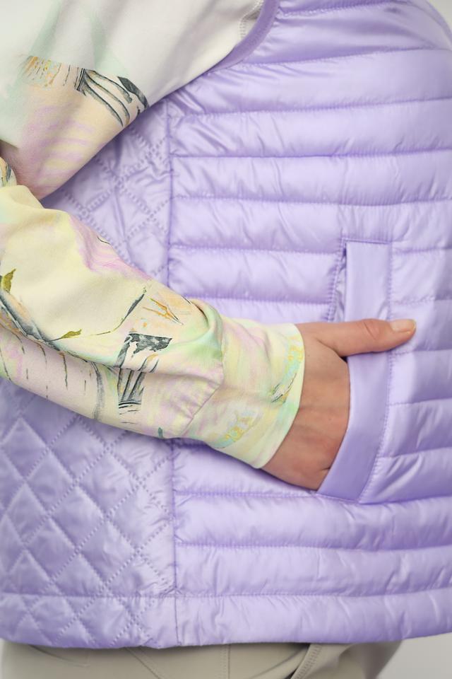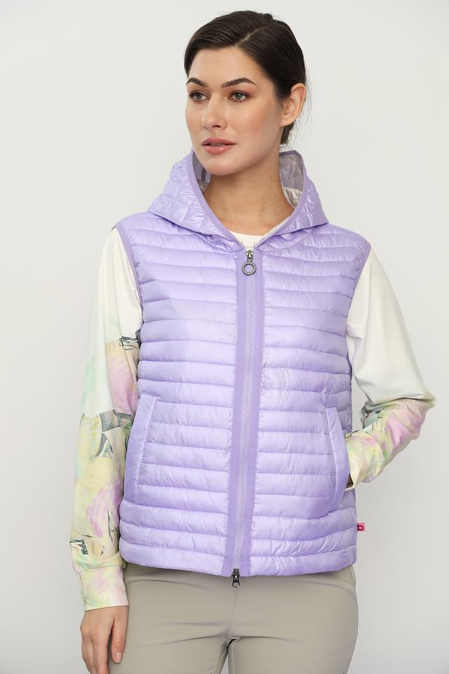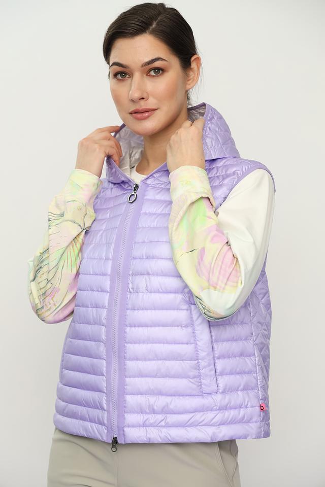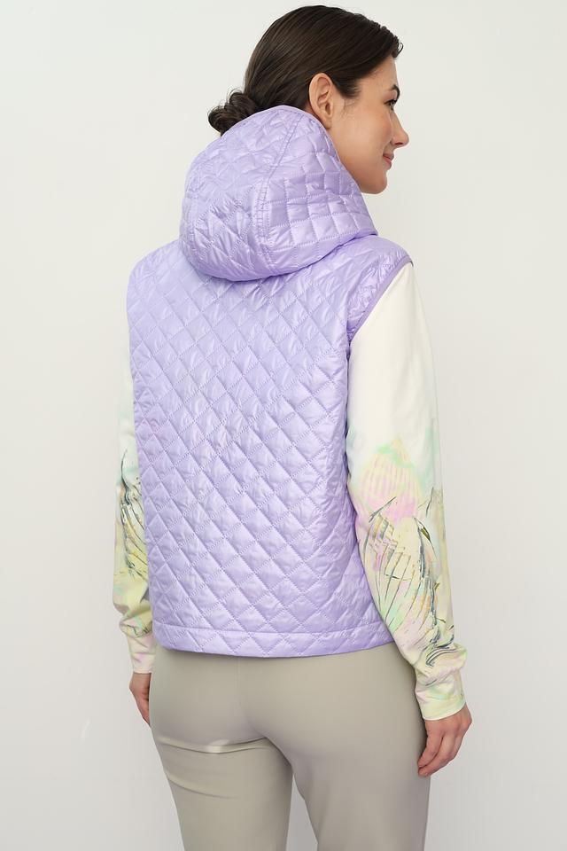 Лавандовый цвет придает жилету нежность и женственность, а стеганая текстура добавляет современный акцент. Модель оснащена удобным капюшоном и застежкой-молнией, что позволяет регулировать степень защиты от ветра и холода.