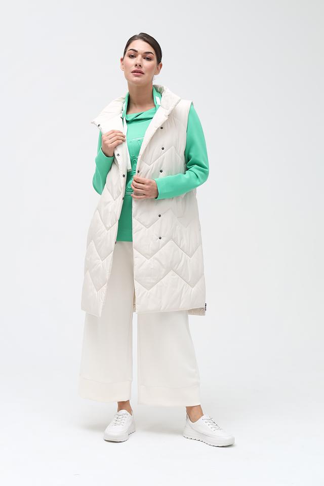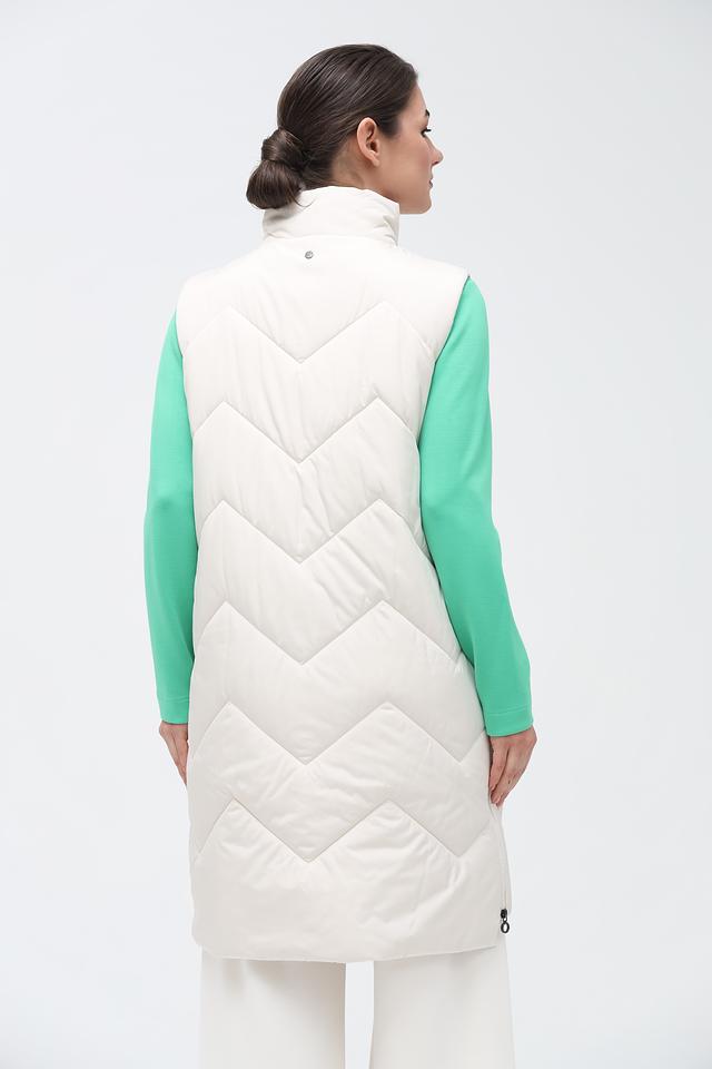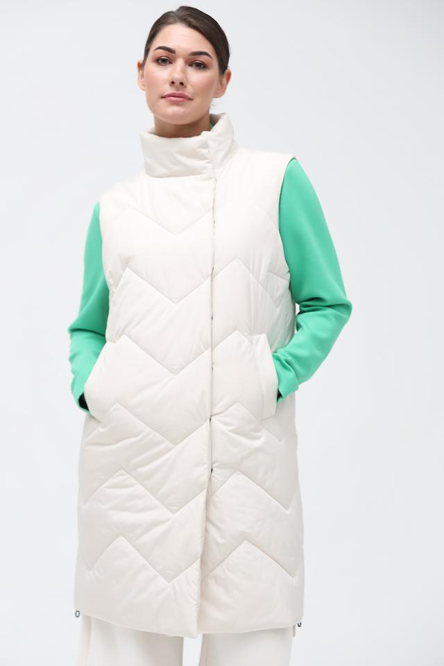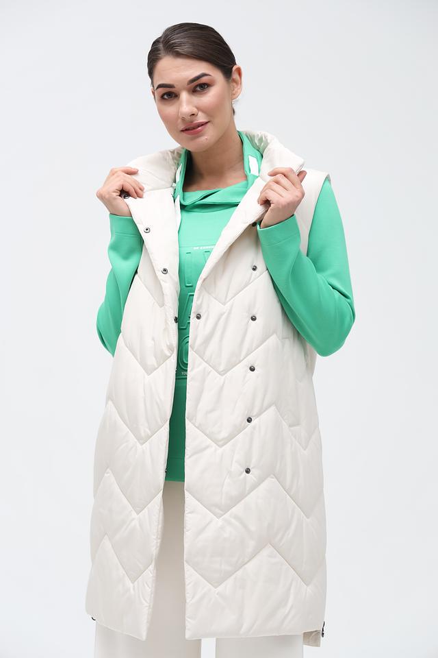 Жилет имеет удлиненный крой, который обеспечивает дополнительное тепло и комфорт. Стеганая фактура придает модели современный и стильный вид. Застежка на кнопки позволяет легко надевать и снимать жилет.