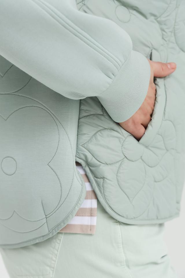 Куртка имеет стеганую фактуру с цветочным орнаментом, что придает ей особый шарм. Высокий воротник-стойка защищает от ветра, а застежка-молния позволяет легко регулировать степень теплоизоляции.