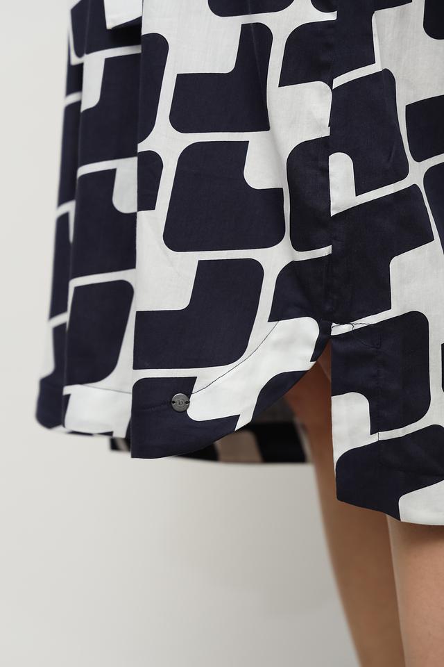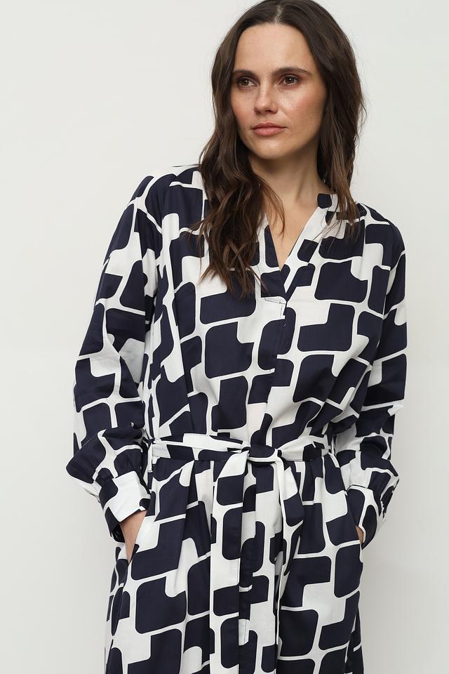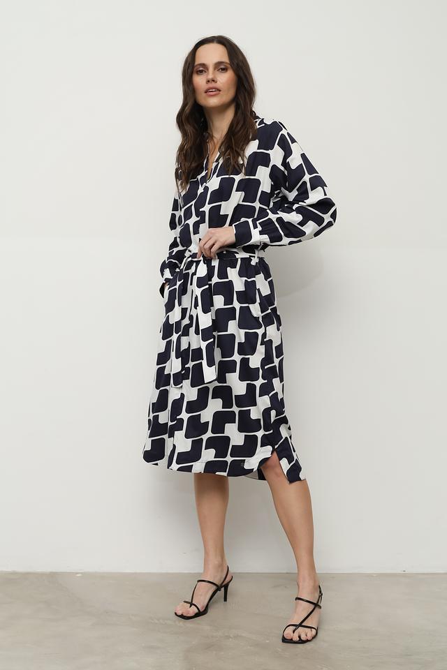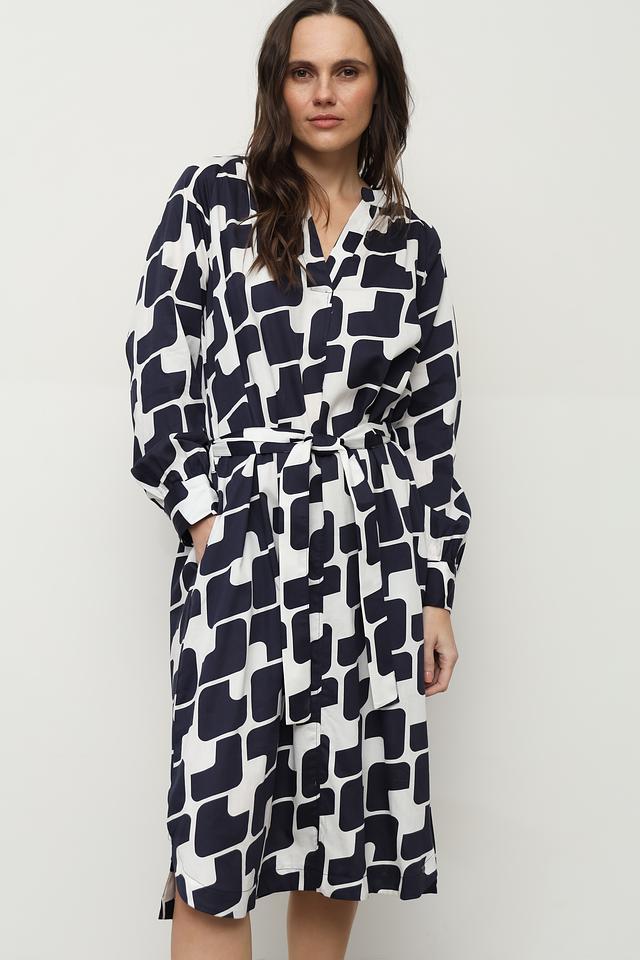 Платье Bugatti белого и синего цвета с оригинальным геометрическим принтом. Модель выполнена в стиле рубашка с длинными рукавами и поясом, подчеркивающим талию. Состав: хлопок 100%
