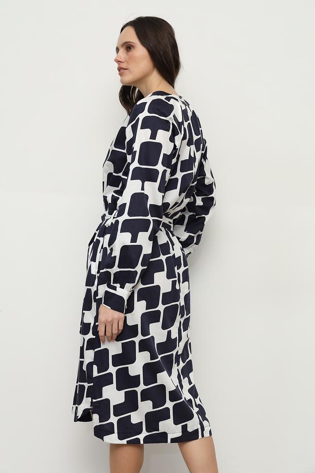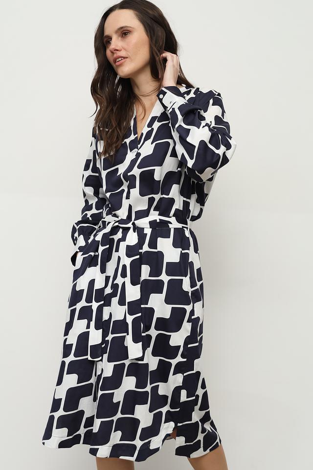Основной цвет платья – белый, дополненный ярким синим геометрическим принтом. Силуэт платья свободный, но благодаря поясу можно подчеркнуть талию и создать более женственный образ. Длинные рукава и V-образный вырез добавляют платью изысканности.