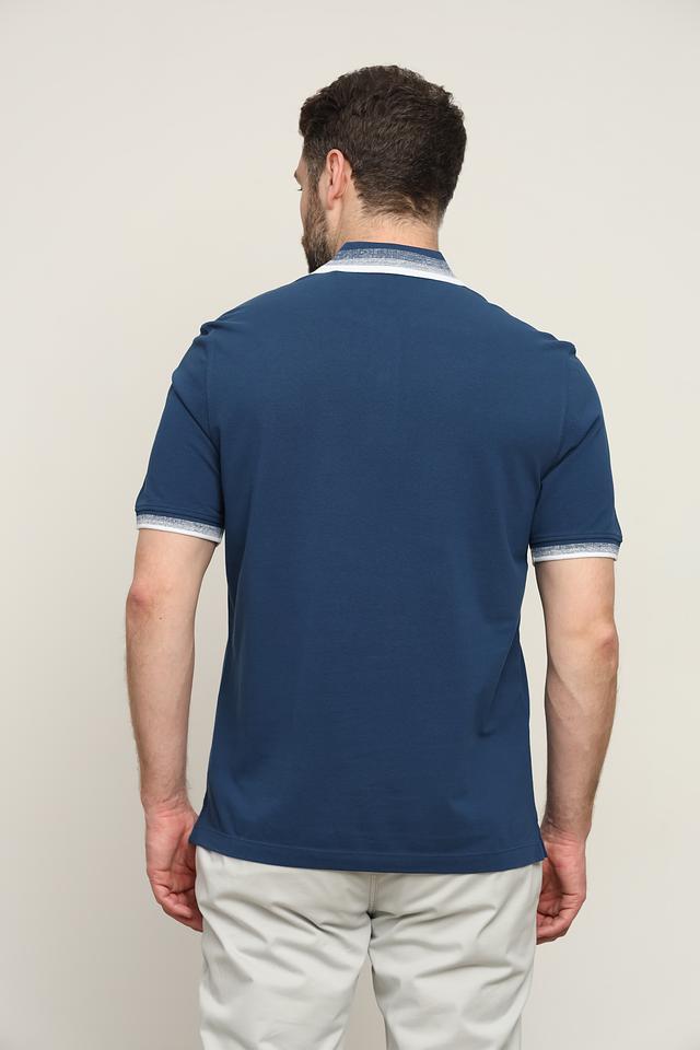Поло выполнено в насыщенном синем цвете, который легко сочетается с различными элементами одежды. Отличительной особенностью модели является контрастная полоска на воротнике и манжетах, выполненная в белом и сером цветах, что придает ей особый шарм.