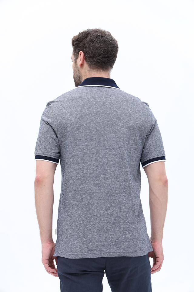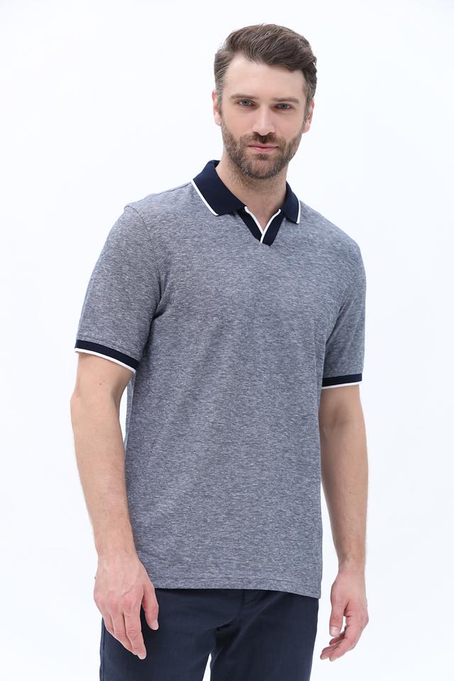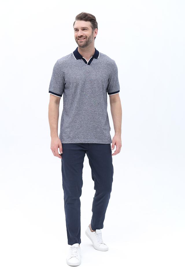 Воротник и манжеты рукавов отделаны тёмно-синей полоской, что добавляет поло динамичности и стиля. Поло выполнено из высококачественного хлопка (85%) с добавлением льна (15%), что обеспечивает комфорт в носке и хорошую воздухопроницаемость.