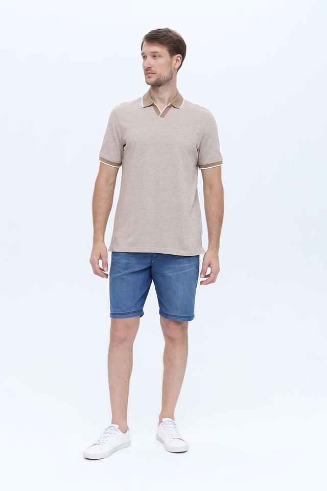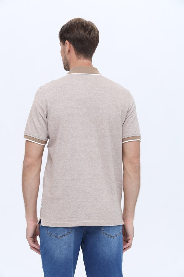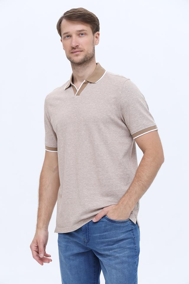 Мужское поло Bugatti бежевого цвета с контрастной отделкой воротника и рукавов. Изготовлено из хлопка с добавлением льна, обеспечивающего комфорт и воздухопроницаемость. Стильное и универсальное решение для повседневного гардероба. Состав: хлопок 85%, лен 15%