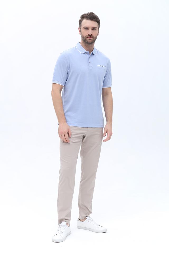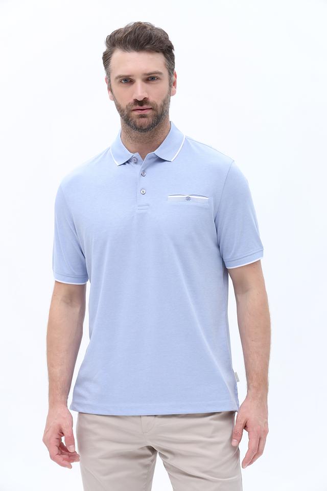 Поло имеет короткие рукава и традиционный воротник-поло с застежкой на пуговицы. На груди расположен накладной карман, который добавляет модели функциональности и стиля. Отделка воротника и рукавов выполнена в белом цвете, что создает контрастный эффект.