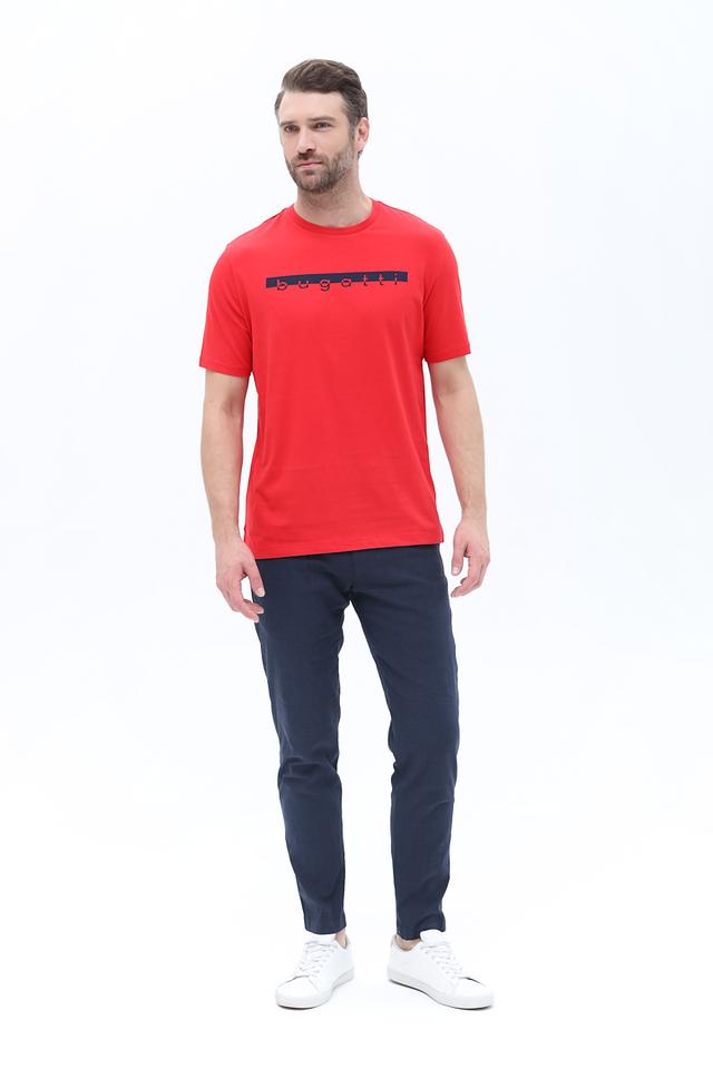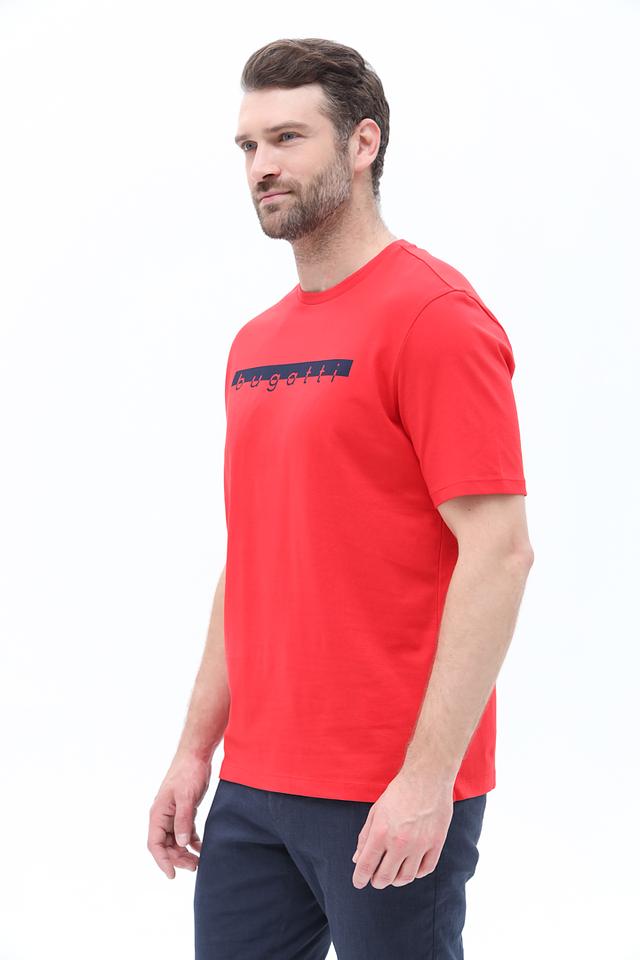 Модель имеет классический прямой крой, который подходит для любого типа фигуры. На груди расположена небольшая контрастная надпись "bugatti", выполненная в черном цвете, что добавляет футболке изысканности.