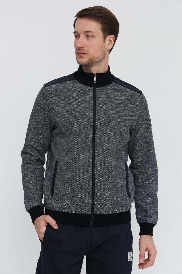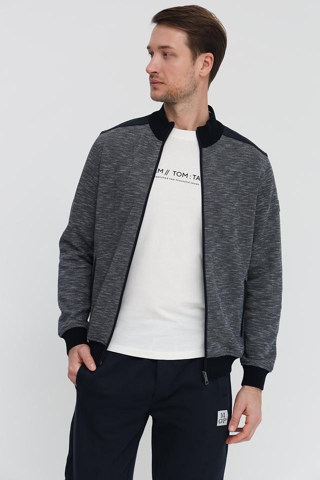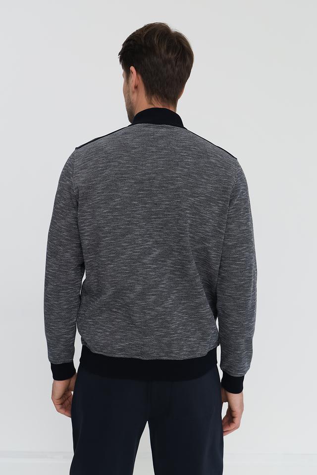 Кардиган имеет застежку-молнию, что позволяет легко регулировать степень тепла. Основной материал – 100% хлопок, обеспечивающий мягкость и комфорт при носке. Декоративные вставки тёмно-синего цвета на плечах и манжетах добавляют модели стильный акцент.