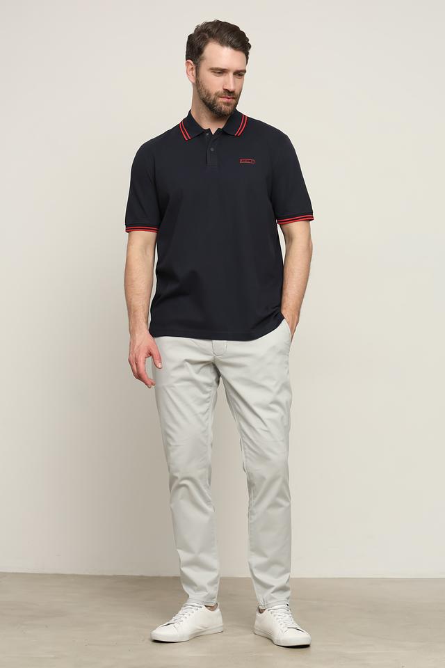 Мужское поло от Bugatti выполнено в тёмно-синем цвете с контрастной красной отделкой по краю воротника и рукавов. Эта модель сочетает в себе элегантность и удобство, идеально подходит для повседневной носки.