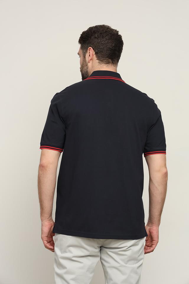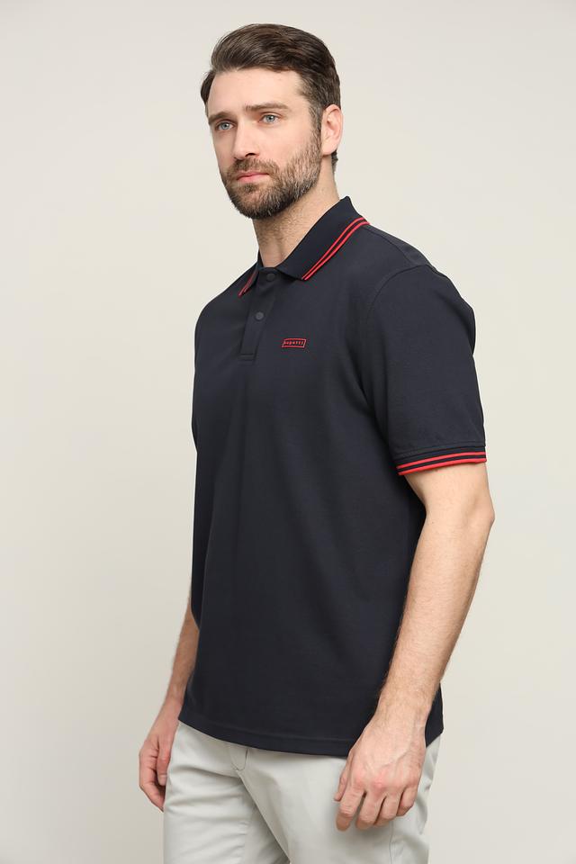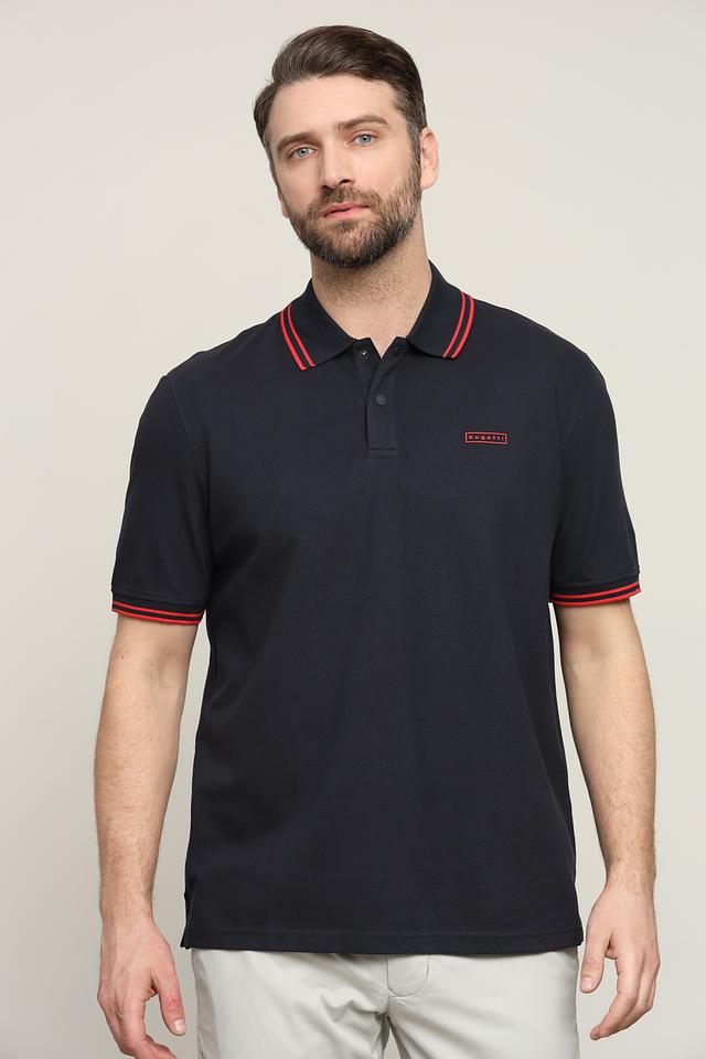 Мужское поло Bugatti тёмно-синего цвета с красной отделкой на воротнике и рукавах. Классический крой и качественный состав обеспечивают комфорт и долговечность. Состав: хлопок 96%, эластан 4%