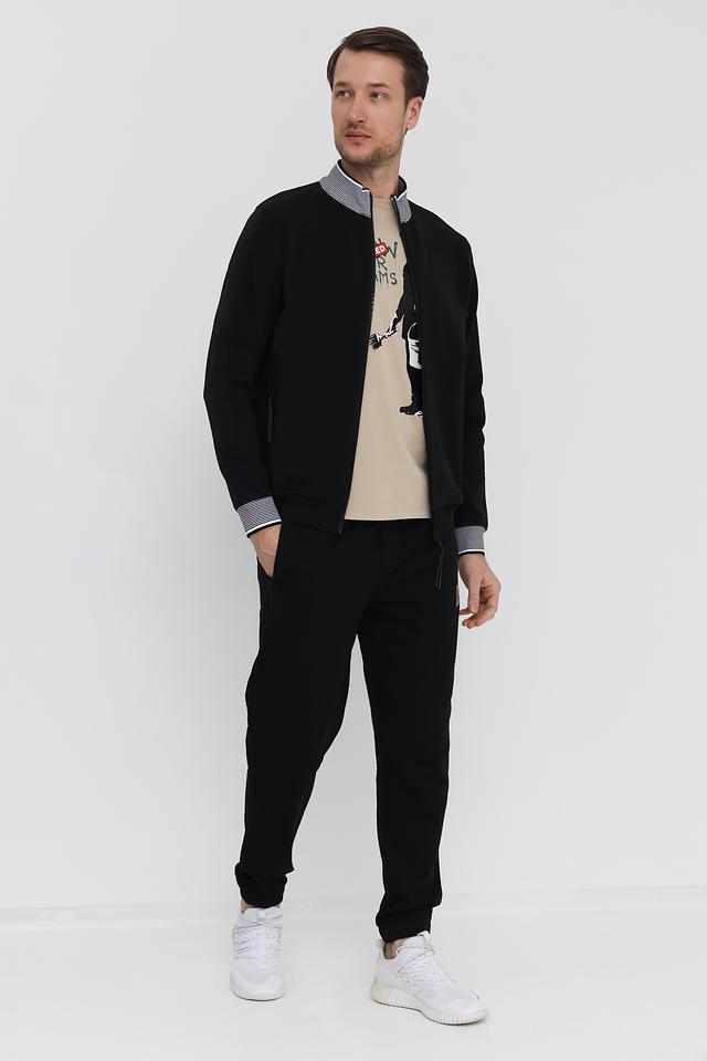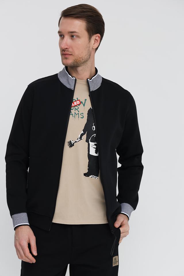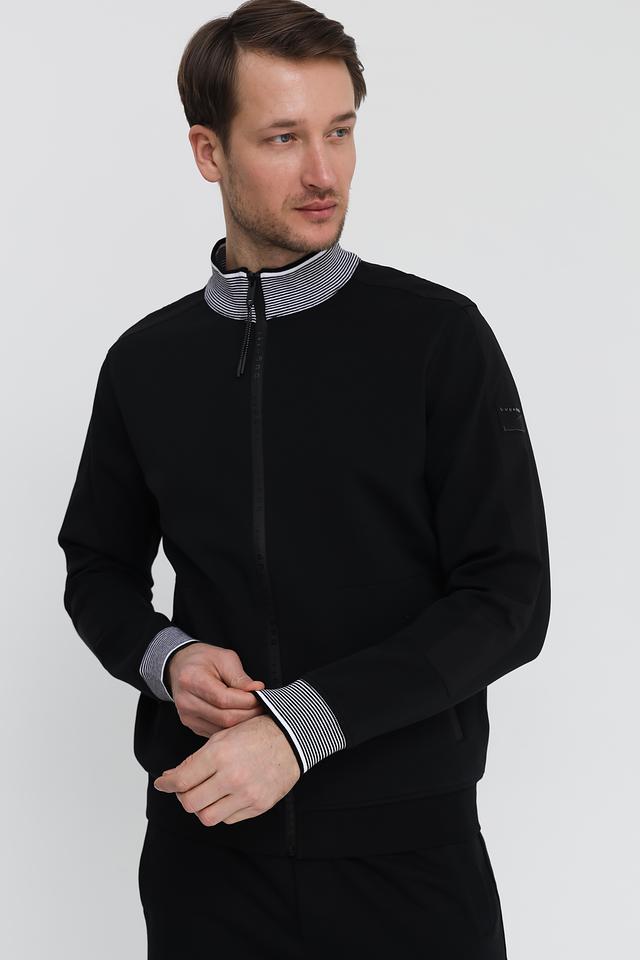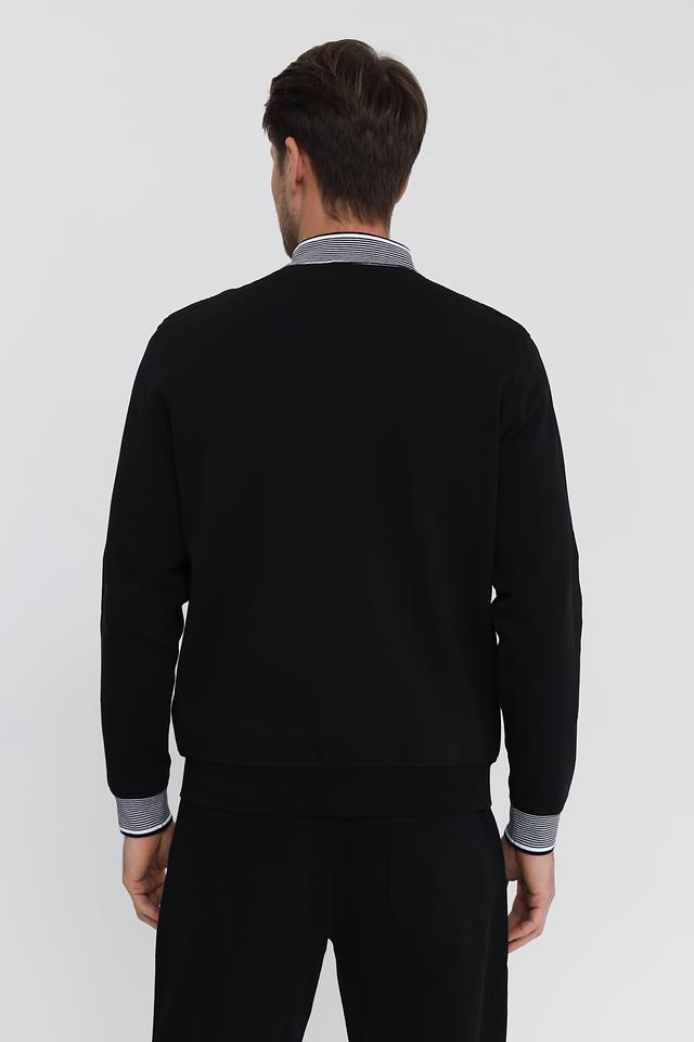 Кардиган имеет классический крой с застёжкой на молнию. Воротник-стойка и манжеты рукавов отделаны полосатым узором в бело-синюю полоску, что добавляет модели изысканности. Чёрный цвет делает кардиган универсальным элементом гардероба, который легко сочетается с различными стилями одежды.