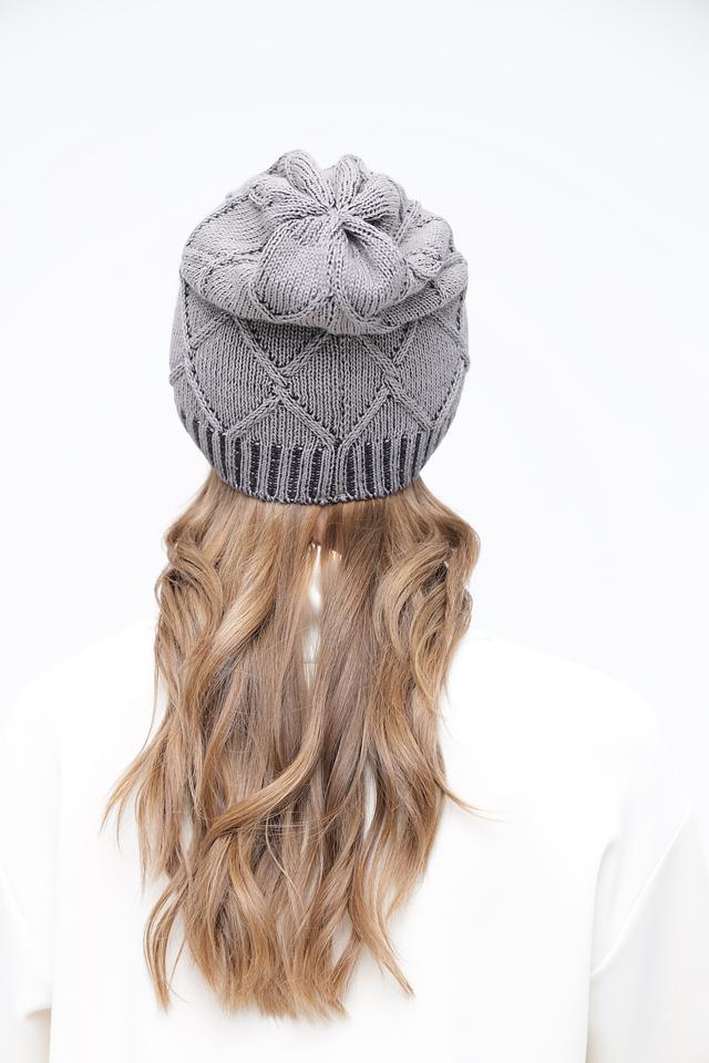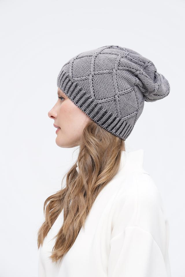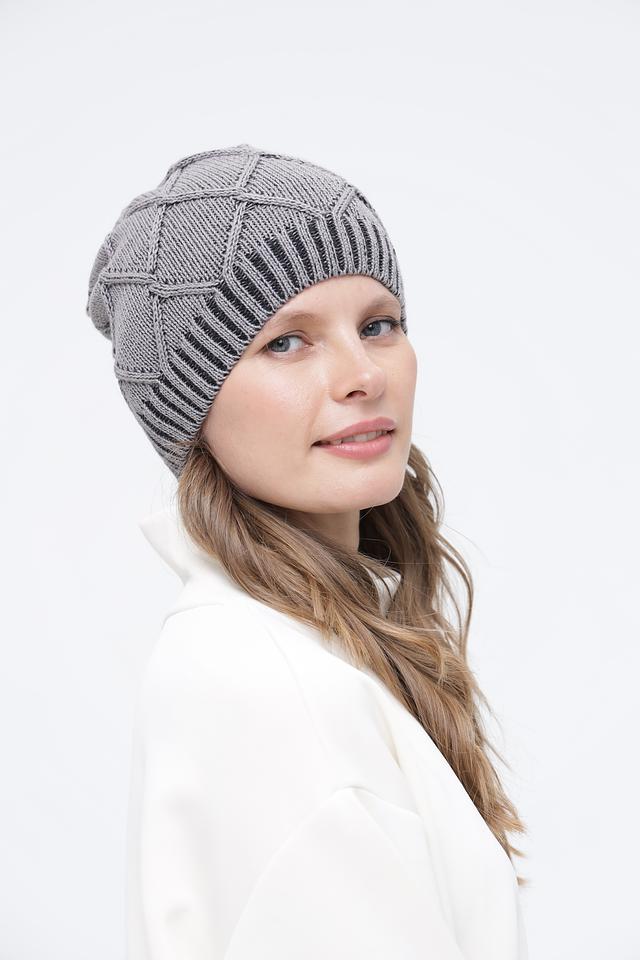 Шапка имеет классический дизайн с вязаным узором, который придает ей элегантный вид. Серый цвет делает ее универсальной и легко сочетаемой с различными элементами гардероба. Узор выполнен в виде ромбов, что добавляет шапке текстуру и визуальный интерес.
